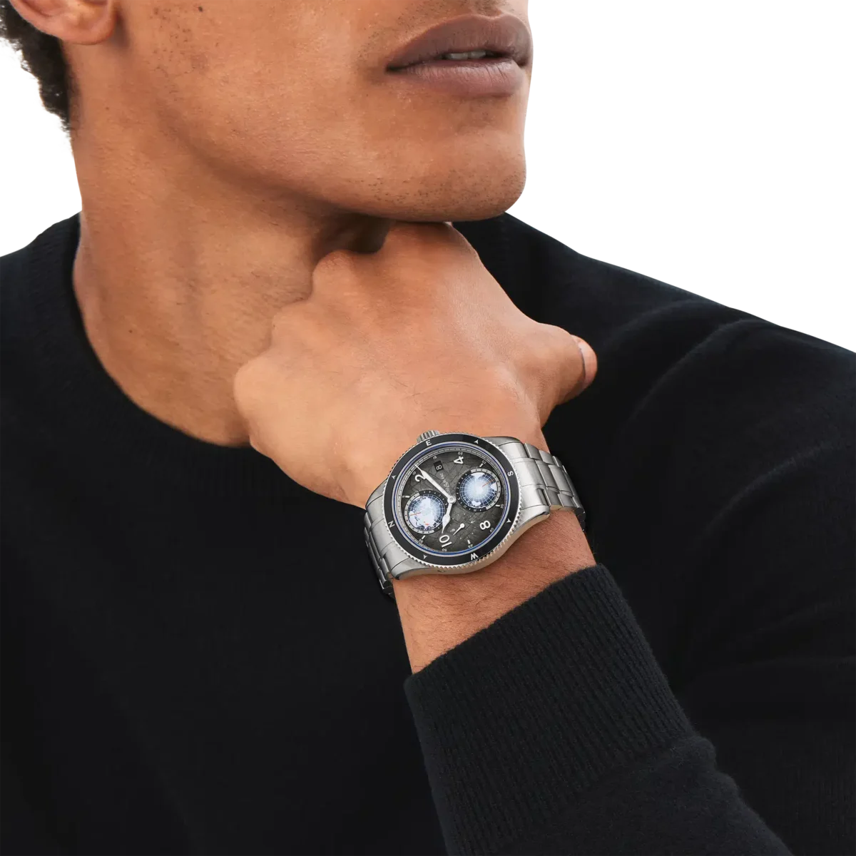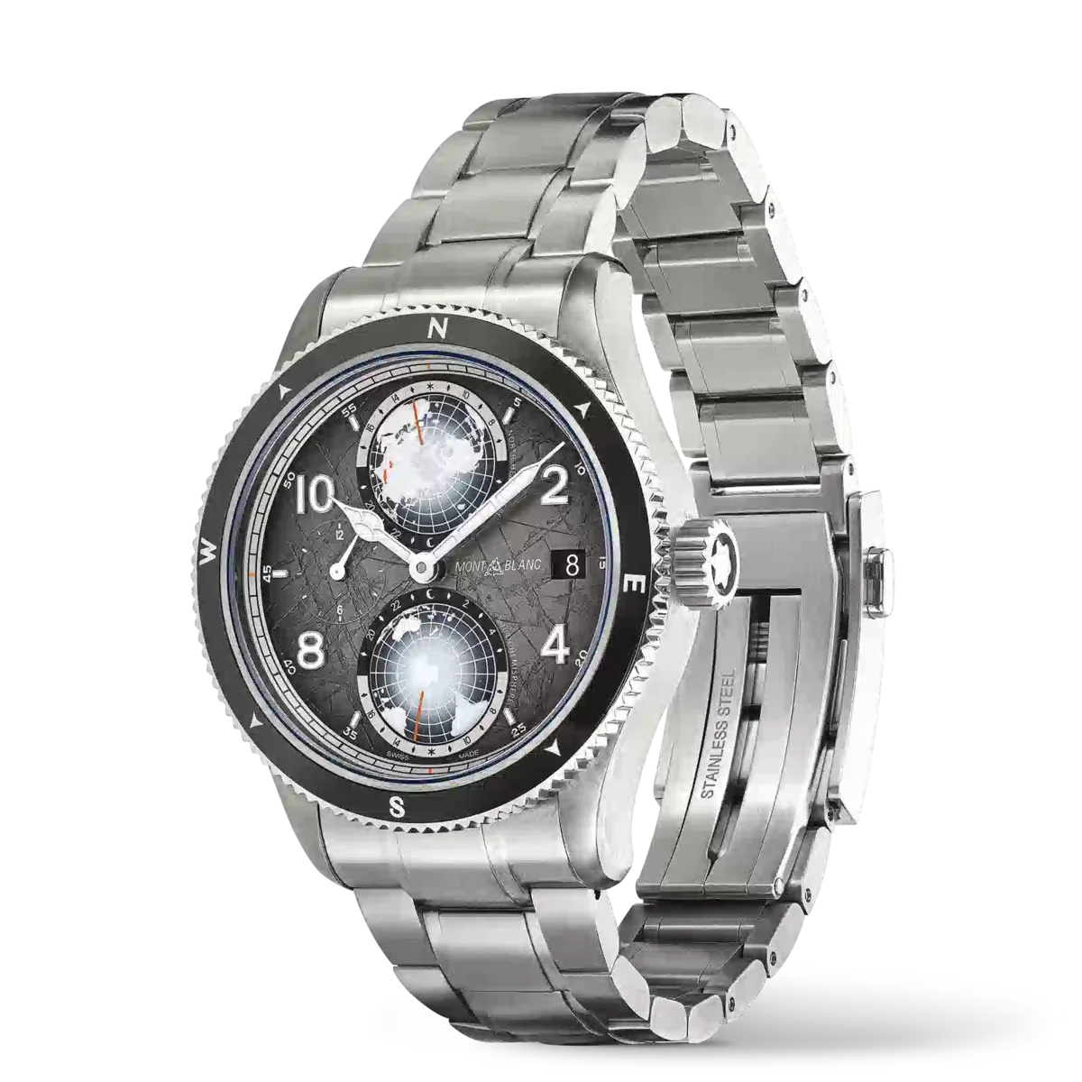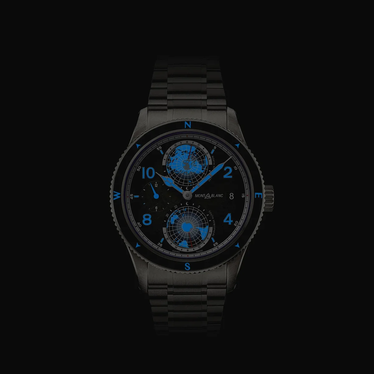 Als Hommage an die höchsten Gipfel der Welt und die Alpinisten, die es wagen, sie unter extremen Bedingungen zu besteigen, ist diese Montblanc 1858 Geosphere 0 Oxygen The 8000 in einem 42-mm-Titangehäuse untergebracht, das völlig sauerstofffrei ist. Dies hat für Entdecker mehrere Vorteile, da es Beschlagen verhindert und Oxidation verhindert, wodurch das Uhrwerk länger hält und eine höhere Präzision gewährleistet ist. Der Zeitmesser wird vom Automatikwerk MB 29.25 mit Manufaktur-Weltzeitkomplikation angetrieben, das die Zeit der 24-Stunden-Zonen auf den leuchtenden Kontinenten der drehbaren 3D-Globen der nördlichen und südlichen Hemisphäre, Tag- und Nachtanzeigen, eine Dualzeitanzeige und ein Datum anzeigt. Die Uhr verfügt außerdem über eine geriffelte, bidirektionale schwarze Keramiklünette mit lumineszierenden Himmelsrichtungen, ein sfumato-dunkelgraues Zifferblatt mit Gletschermuster und orangefarbenen Akzenten sowie ein austauschbares Titanarmband mit einem Verjüngungs- und Feineinstellungssystem. Der Gehäuseboden dieses Modells ist mit einer 3D-Lasergravur des K2 versehen, die mit unglaublicher Farbgebung, Tiefe und Realismus dargestellt ist. Ident-Nr. MB130982