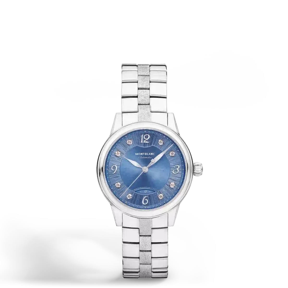 Die Montblanc Bohème Automatic Date interpretiert die Codes der hohen Uhrmacherkunst auf elegante und feminine Weise. Sie ist von der Welt der Handschrift inspiriert und verfügt über ein 30-mm-Edelstahlgehäuse. Sie verfügt über ein elegantes, blaues Zifferblatt mit Sonnenschliff, das mit Diamantindexen, rhodinierten arabischen Ziffern und Zeigern verziert ist. Weitere raffinierte Details sind ein Filet-Sauté-Muster und eine Prägetechnik namens Filé d’étoiles. Ausgestattet mit dem Automatikwerk MB 24.29 zeigt dieses Modell die Stunden, Minuten und Sekunden sowie das Datum in einer mandelförmigen Öffnung mit handgeschriebenen Ziffern an. Die romantische Schriftart wurde auch für die Aufschrift „Automatic” auf dem Zifferblatt verwendet. Diese Uhr ist mit einem austauschbaren Edelstahlarmband mit strukturiertem Mittelglied und Feineinstellungssystem ausgestattet. Ident-Nr. MB134341