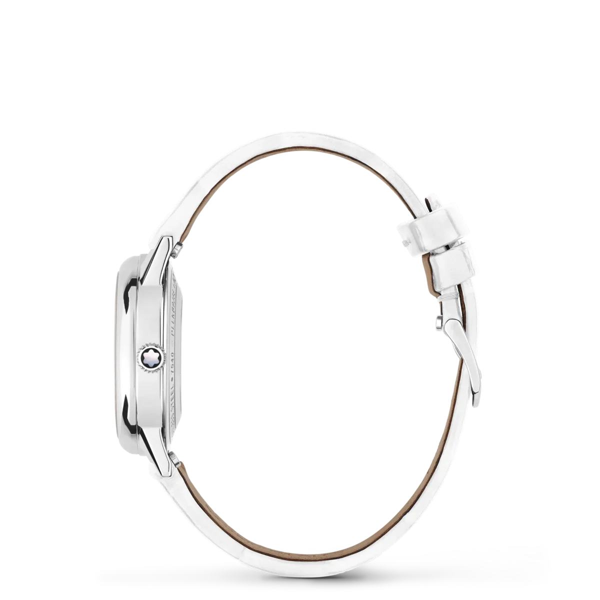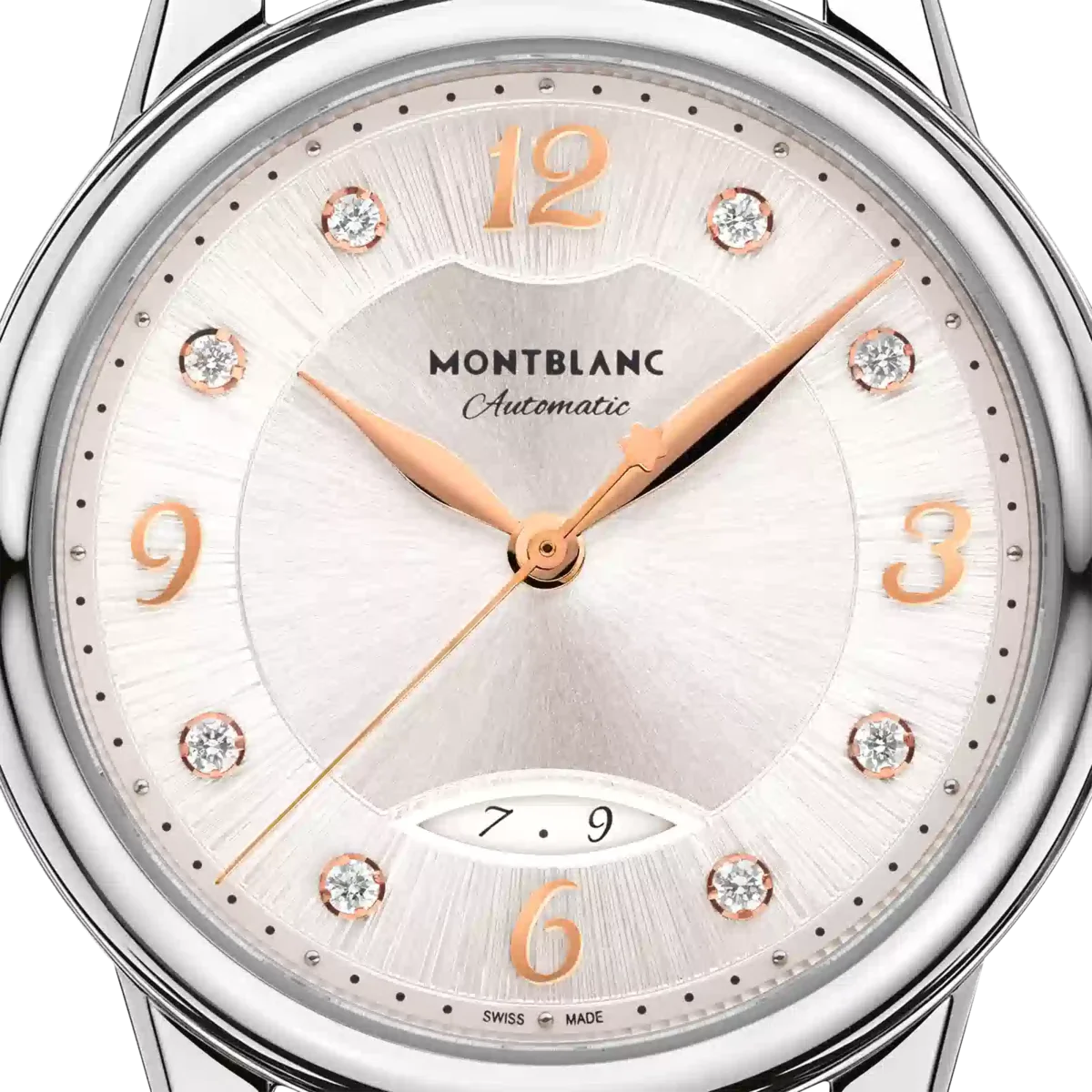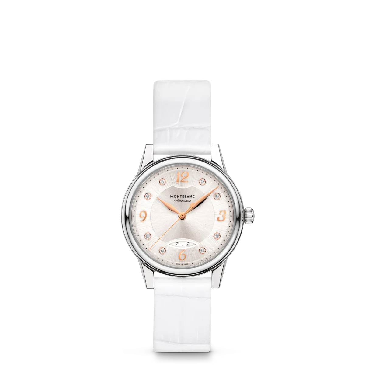 Die Montblanc Bohème Automatic Date interpretiert die Codes der hohen Uhrmacherkunst auf elegante und feminine Weise. Sie ist von der Welt der Handschrift inspiriert und verfügt über ein 30-mm-Edelstahlgehäuse. Sie verfügt über ein elegantes, silberweißes Zifferblatt mit Sonnenschliff, das mit Diamantindexen, rosévergoldeten arabischen Ziffern und Zeigern verziert ist. Weitere raffinierte Details sind ein Filet-Sauté-Muster und eine Stanztechnik namens Filé d’étoiles. Ausgestattet mit dem Automatikwerk MB 24.29 zeigt dieses Modell die Stunden, Minuten und Sekunden sowie das Datum in einer mandelförmigen Öffnung mit handgeschriebenen Ziffern an. Die romantische Schriftart wurde auch für die Aufschrift „Automatic” auf dem Zifferblatt verwendet. Diese Uhr ist mit einem austauschbaren weißen Kalbslederarmband mit Alligatorprägung und einem zusätzlichen Armband ausgestattet. Ident-Nr. MB133305 Bandbreite 14 mm