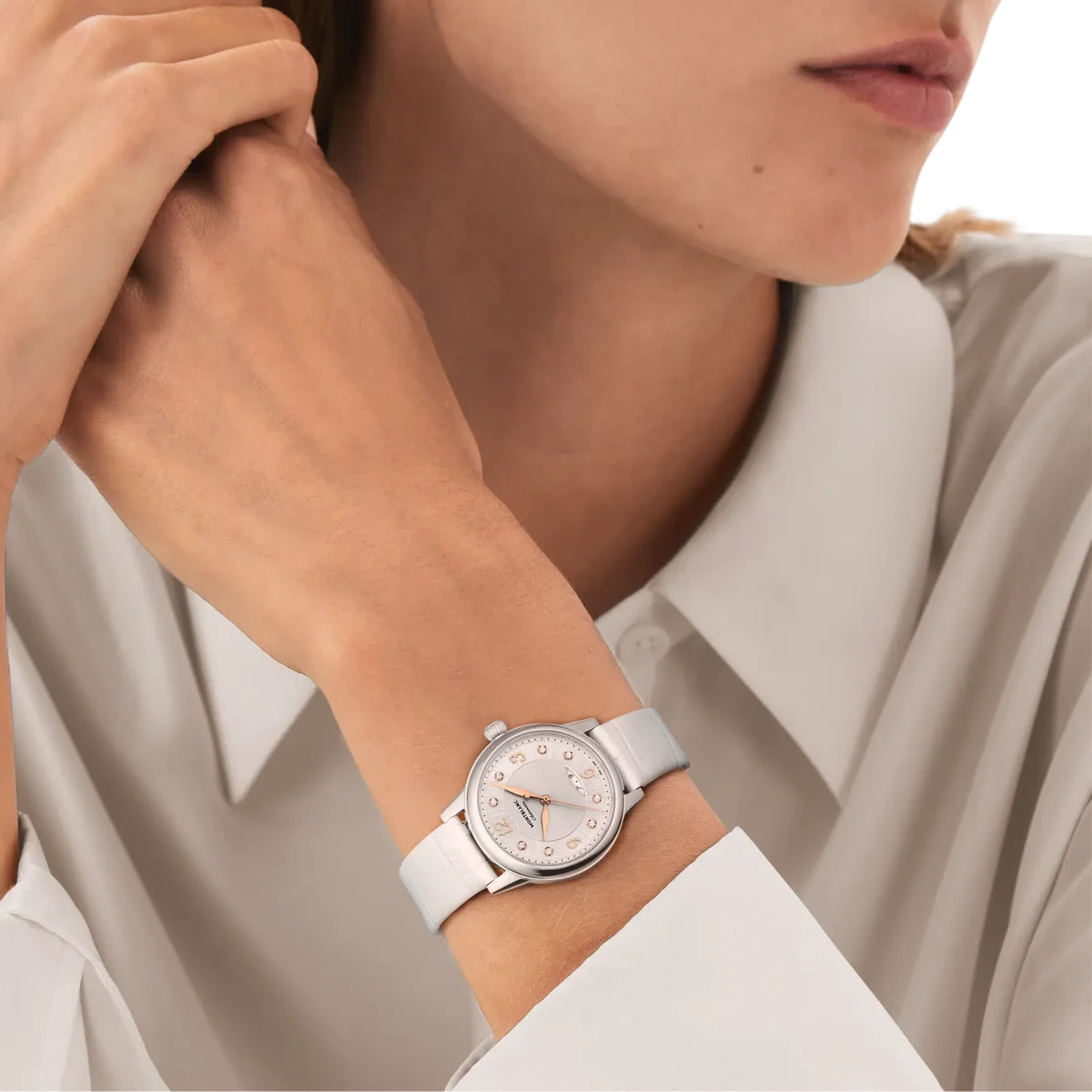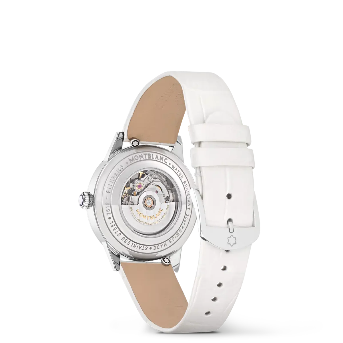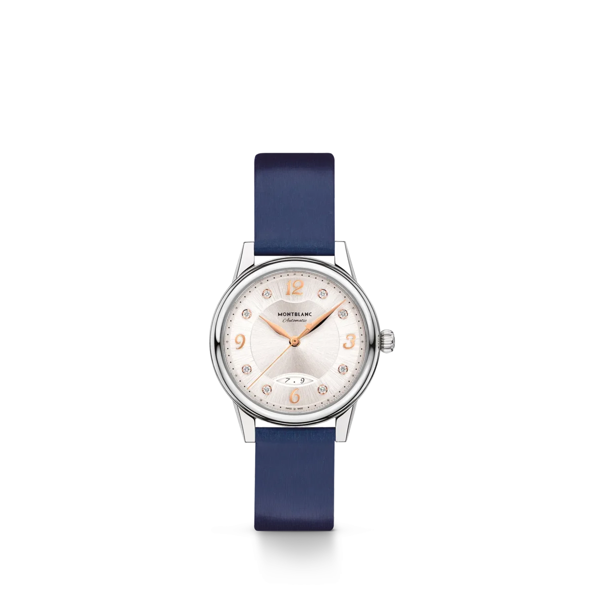 Die Montblanc Bohème Automatic Date interpretiert die Codes der hohen Uhrmacherkunst auf elegante und feminine Weise. Sie ist von der Welt der Handschrift inspiriert und verfügt über ein 30-mm-Edelstahlgehäuse. Sie verfügt über ein elegantes, silberweißes Zifferblatt mit Sonnenschliff, das mit Diamantindexen, rosévergoldeten arabischen Ziffern und Zeigern verziert ist. Weitere raffinierte Details sind ein Filet-Sauté-Muster und eine Stanztechnik namens Filé d’étoiles. Ausgestattet mit dem Automatikwerk MB 24.29 zeigt dieses Modell die Stunden, Minuten und Sekunden sowie das Datum in einer mandelförmigen Öffnung mit handgeschriebenen Ziffern an. Die romantische Schriftart wurde auch für die Aufschrift „Automatic” auf dem Zifferblatt verwendet. Diese Uhr ist mit einem austauschbaren weißen Kalbslederarmband mit Alligatorprägung und einem zusätzlichen Armband ausgestattet. Ident-Nr. MB133305 Bandbreite 14 mm