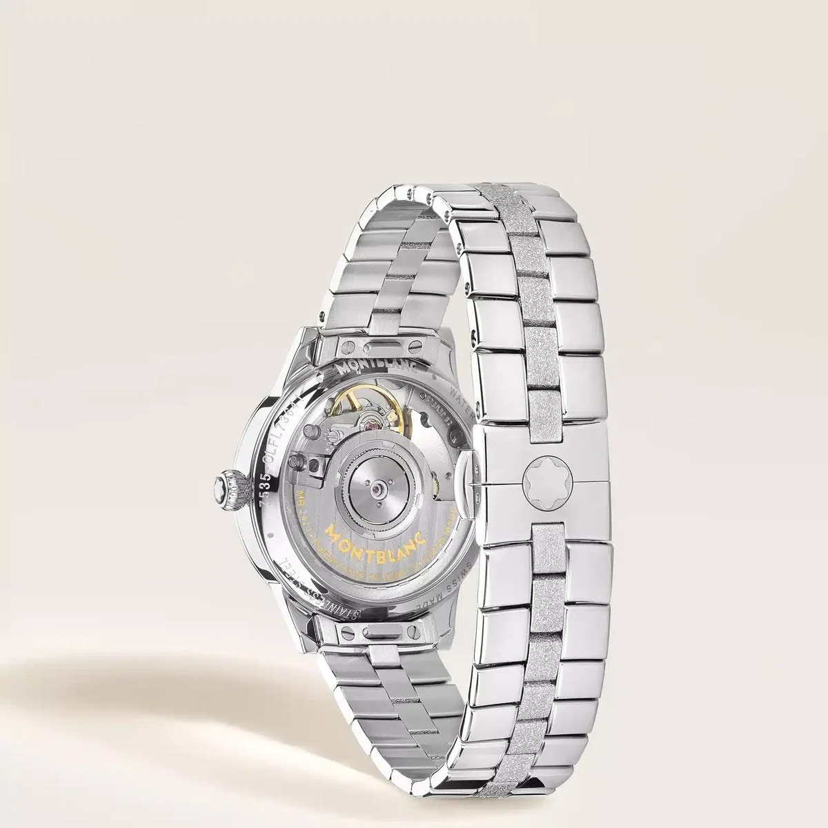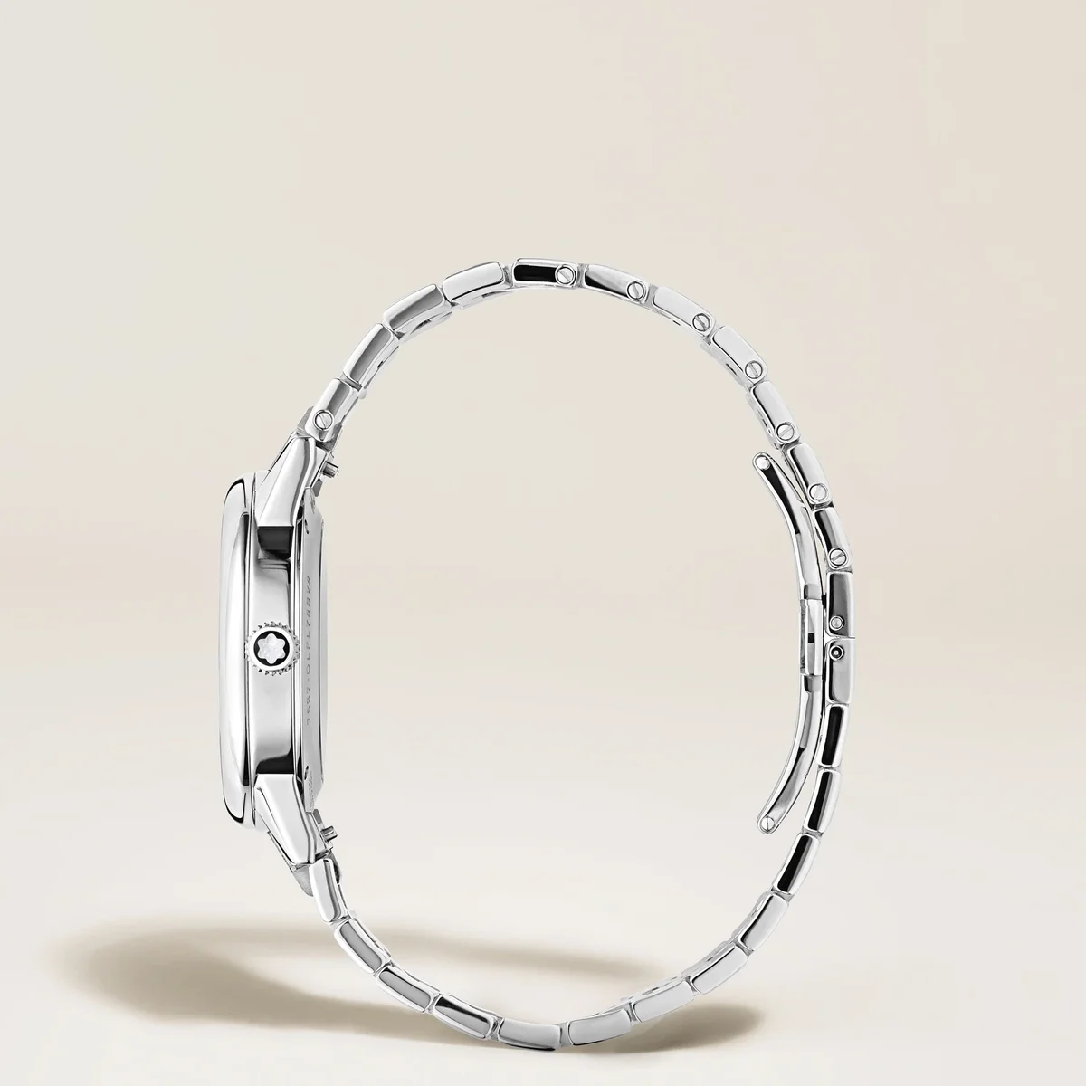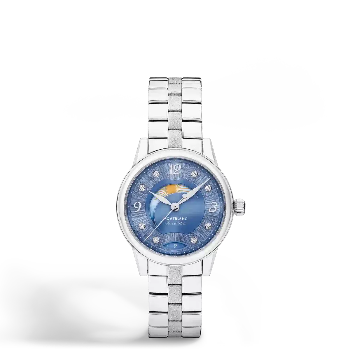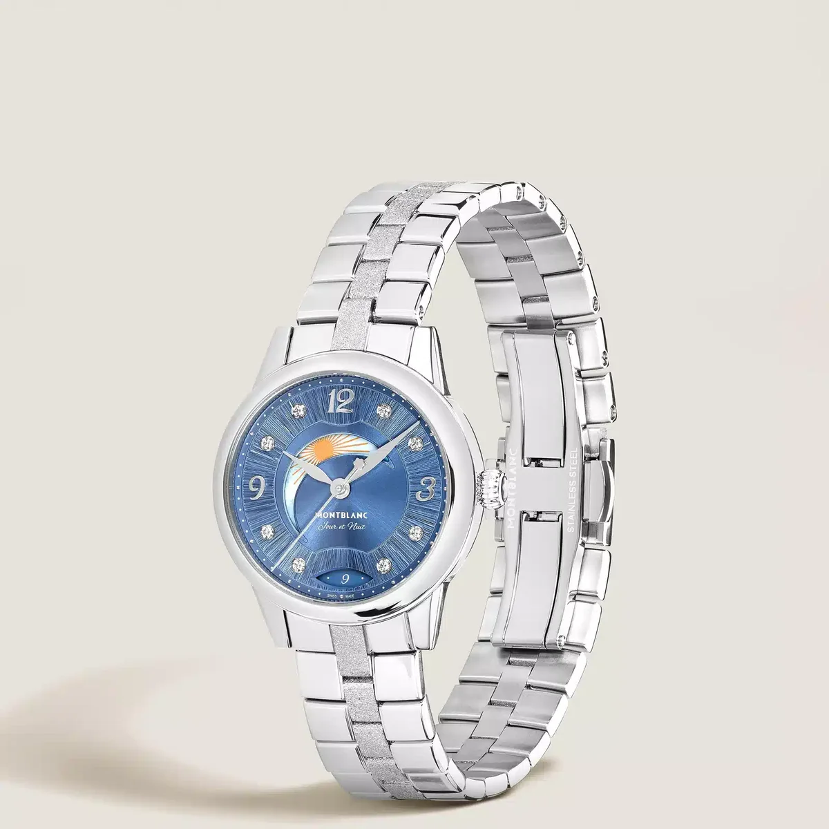 Die Montblanc Bohème Day & Night interpretiert die Codes der hohen Uhrmacherkunst auf elegante und feminine Weise. Sie ist von der Welt der Handschrift und der Aquarellmalerei inspiriert und verfügt über ein 30-mm-Edelstahlgehäuse. Sie verfügt über ein elegantes blaues Zifferblatt mit Sonnenschliff, das mit Diamantindexen, rhodinierten arabischen Ziffern und Zeigern verziert ist. Weitere raffinierte Details sind ein Filet-Sauté-Muster und eine Stanztechnik namens Filé d’étoiles. Ausgestattet mit dem Automatikwerk MB 24.20 zeigt dieses Modell die Stunden, Minuten und Sekunden sowie das Datum in einer mandelförmigen Öffnung mit handgeschriebenen Ziffern an. Die romantische Schriftart wurde auch auf dem Zifferblatt für die Tages- und Nachtanzeige „Jour et Nuit” verwendet. Die himmlische Tag- und Nachtkomplikation zeigt den wechselnden Himmel über einen Zeitraum von 24 Stunden und verleiht der Uhr mit ihren Aquarellfarben einen romantischen und künstlerischen Touch. Diese Uhr ist mit einem austauschbaren Edelstahlarmband mit strukturiertem Mittelglied und Feineinstellungssystem ausgestattet. Ident-Nr. MB134342