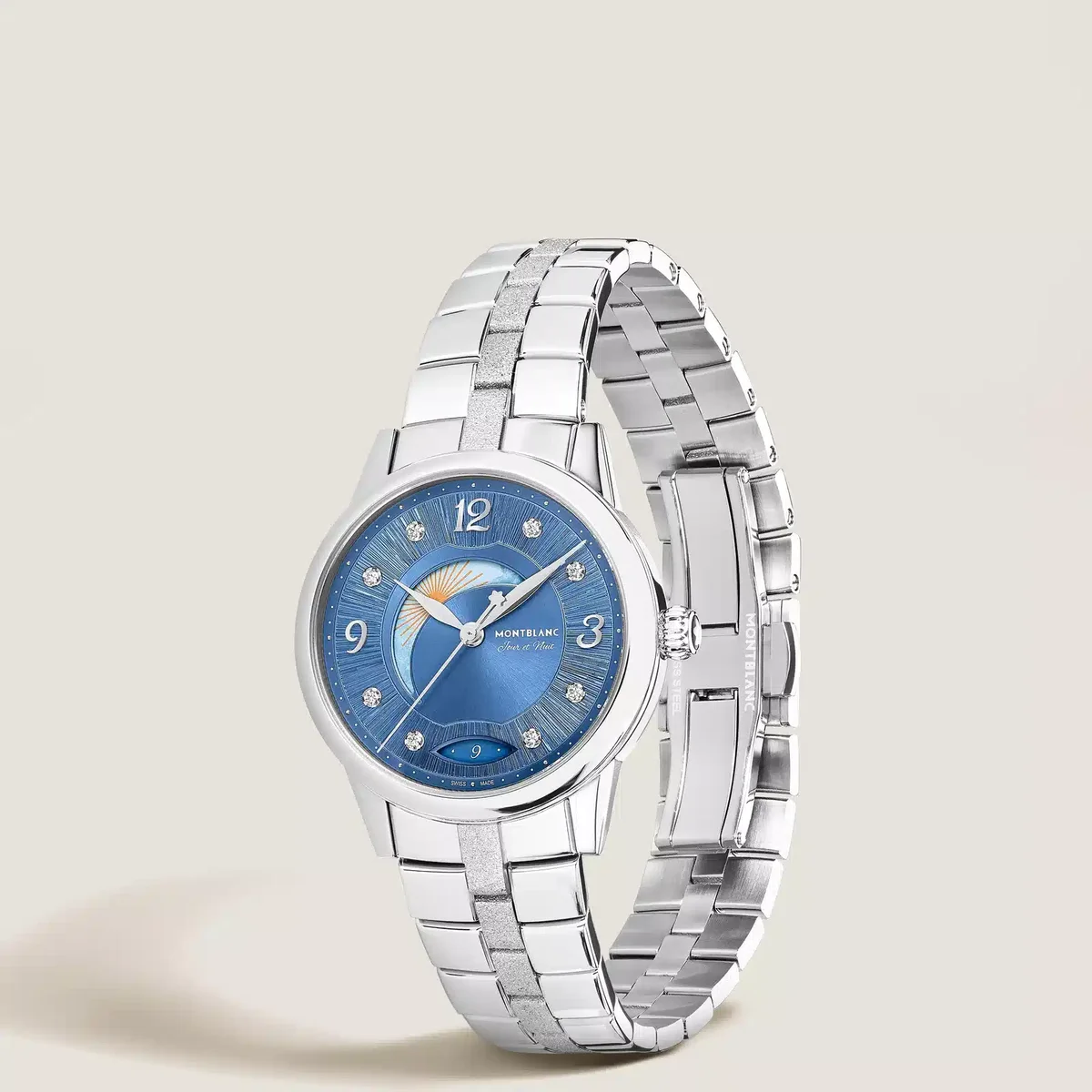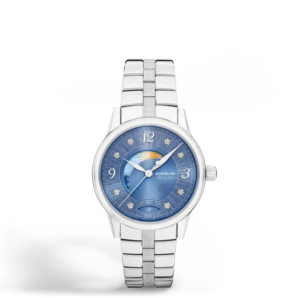 Die Montblanc Bohème Day & Night interpretiert die Codes der hohen Uhrmacherkunst auf elegante und feminine Weise. Sie ist von der Welt der Handschrift und der Aquarellfarben inspiriert und verfügt über ein 34-mm-Edelstahlgehäuse. Sie verfügt über ein elegantes blaues Zifferblatt mit Sonnenschliff, das mit Diamantindexen, rhodinierten arabischen Ziffern und Zeigern verziert ist. Weitere raffinierte Details sind ein Filet-Sauté-Muster und eine Stanztechnik namens Filé d’étoiles. Ausgestattet mit dem Automatikwerk MB 24.20 zeigt dieses Modell die Stunden, Minuten und Sekunden sowie das Datum in einer mandelförmigen Öffnung mit handgeschriebenen Ziffern an. Die romantische Schriftart wurde auch auf dem Zifferblatt für die Tages- und Nachtanzeige „Jour et Nuit” verwendet. Die himmlische Tag- und Nachtkomplikation zeigt den wechselnden Himmel über einen Zeitraum von 24 Stunden und verleiht der Uhr einen romantischen und künstlerischen Touch, da sie mit Wasserfarben gestaltet ist. Diese Uhr ist mit einem austauschbaren Edelstahlarmband mit strukturiertem Mittelglied und Feineinstellungssystem ausgestattet. Ident-Nr. MB134343