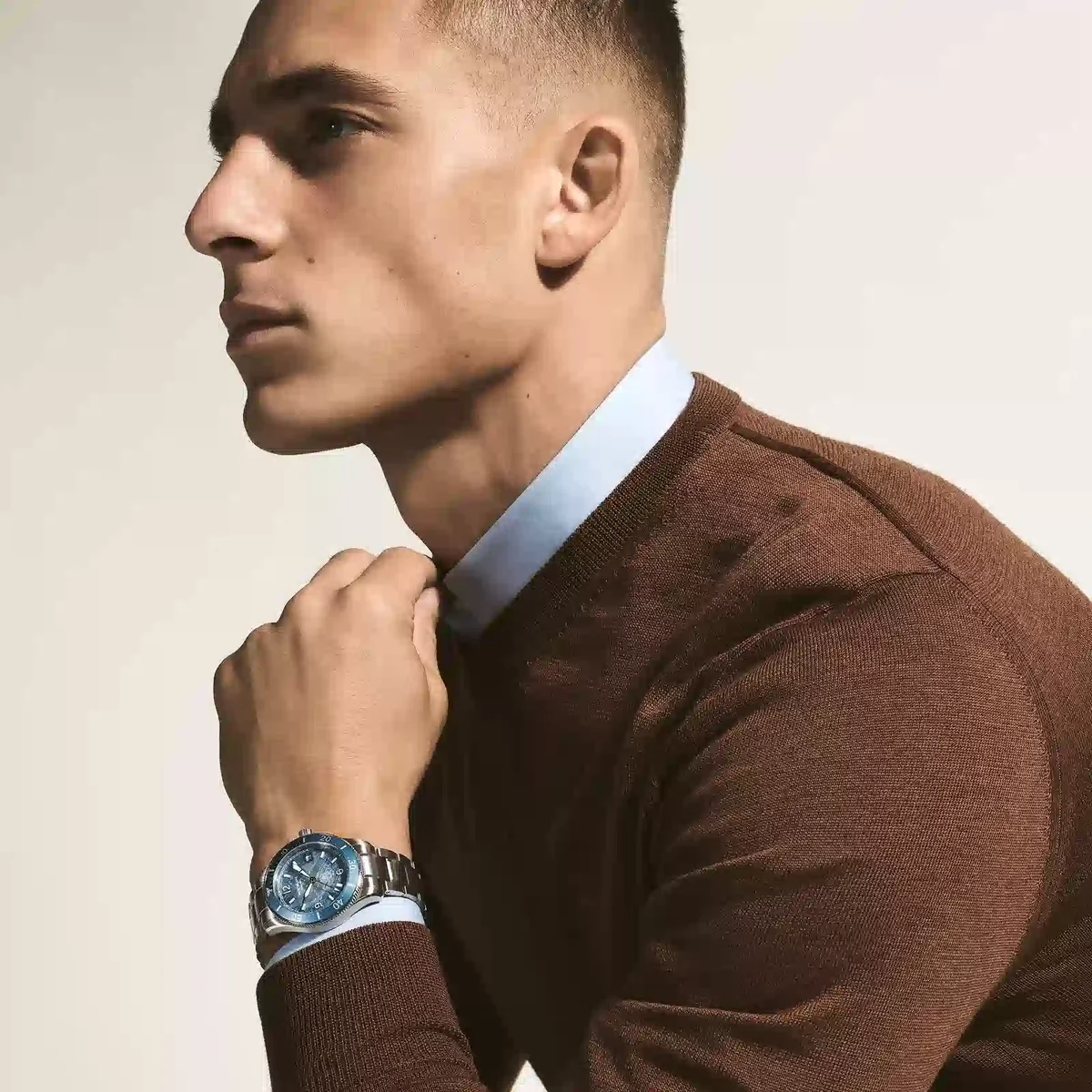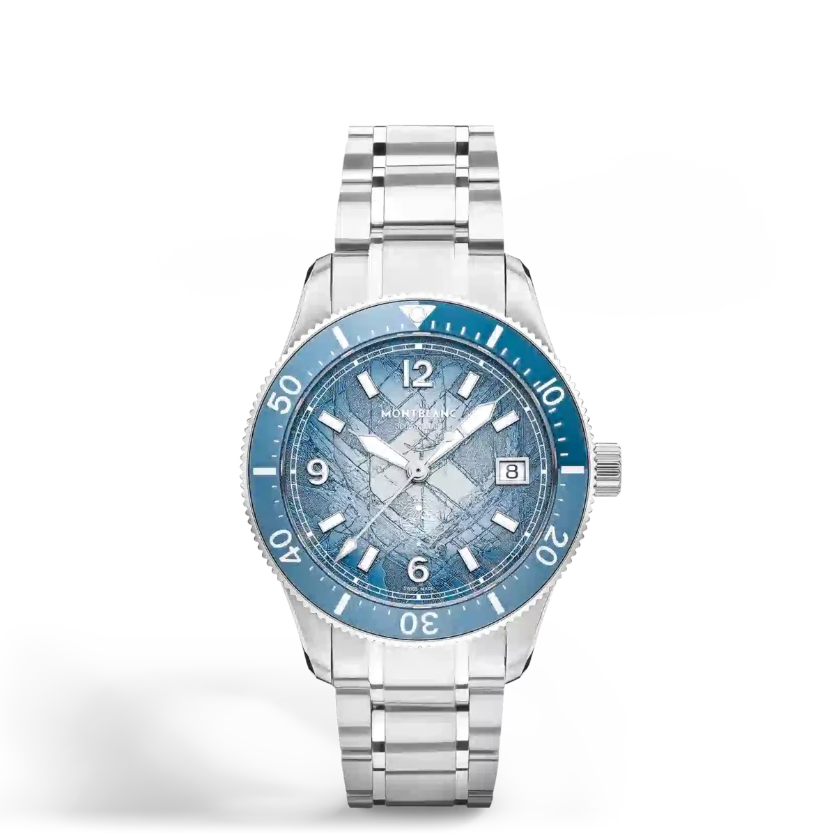 Die Montblanc Iced Sea Automatic Date 0 Oxygen mit blauem Zifferblatt im Sfumato-Gletschermuster vermittelt den Eindruck, als würde man in die Tiefen eines Gletschers blicken. Inspiriert von der Mer de Glace wurde diese Gletscherstruktur mit einer fast vergessenen traditionellen Technik namens „gratté-boisé” erzielt. Die Uhr ist in einem 38-mm-Edelstahlgehäuse untergebracht, das vollständig sauerstofffrei ist, und verfügt über eine einseitig drehbare Lünette mit zweifarbigem, blau eloxiertem Aluminiumeinsatz, eine 3D-Gravur auf dem Gehäuseboden und ein austauschbares Edelstahlarmband mit Feineinstellungssystem. Die Uhr entspricht der Norm ISO 6425 für Taucheruhren und ist bis 300 Meter wasserdicht. Ident-Nr. MB134022
