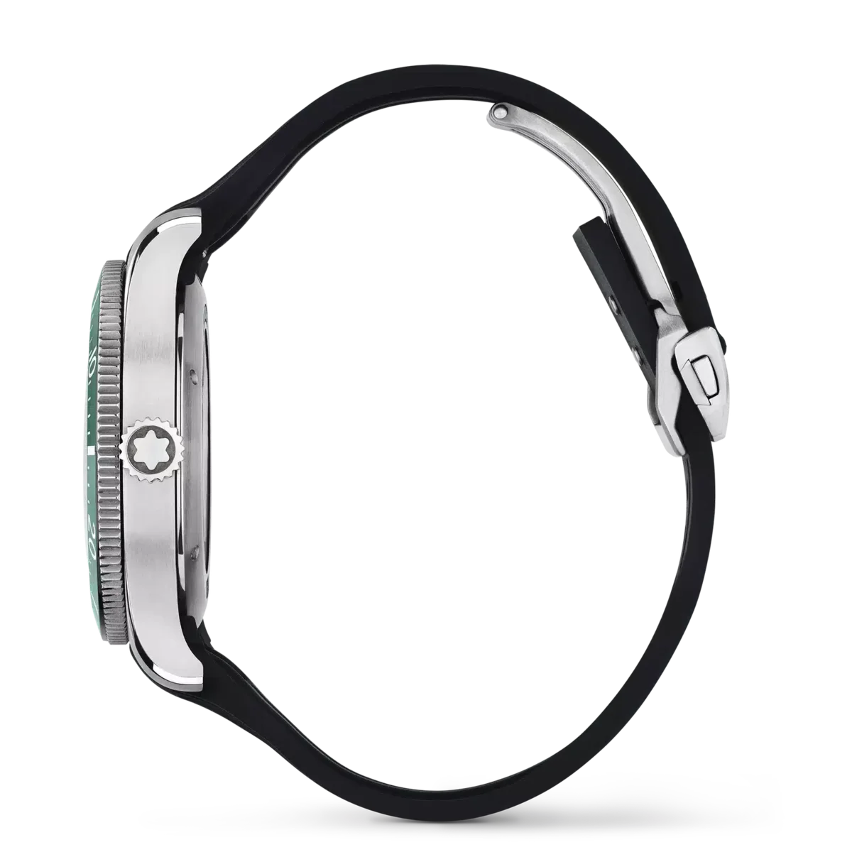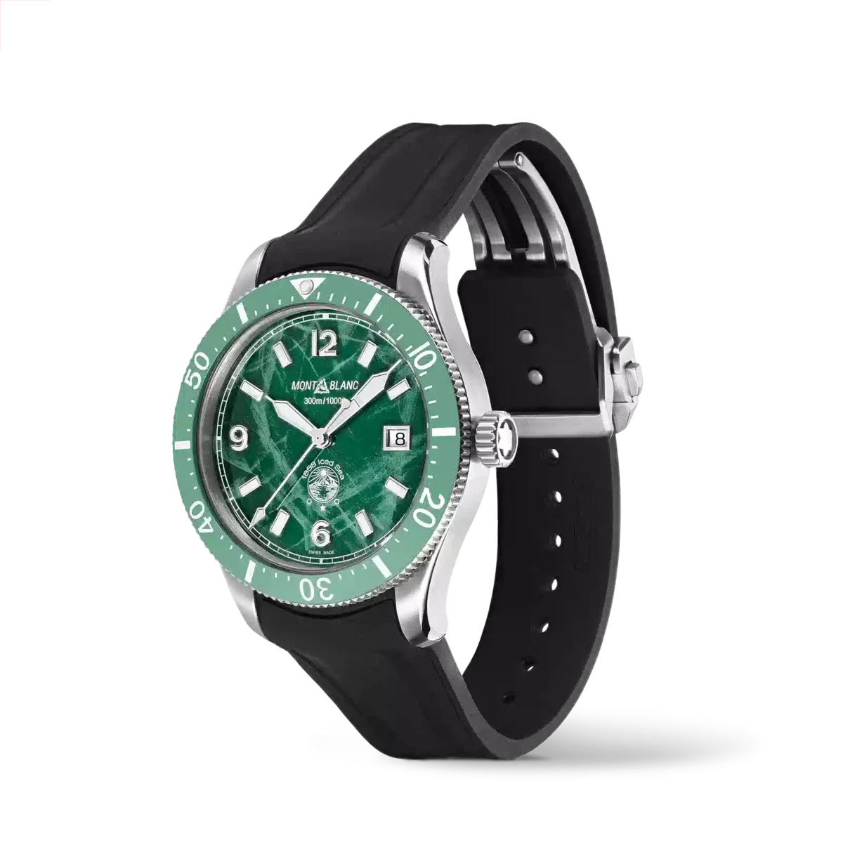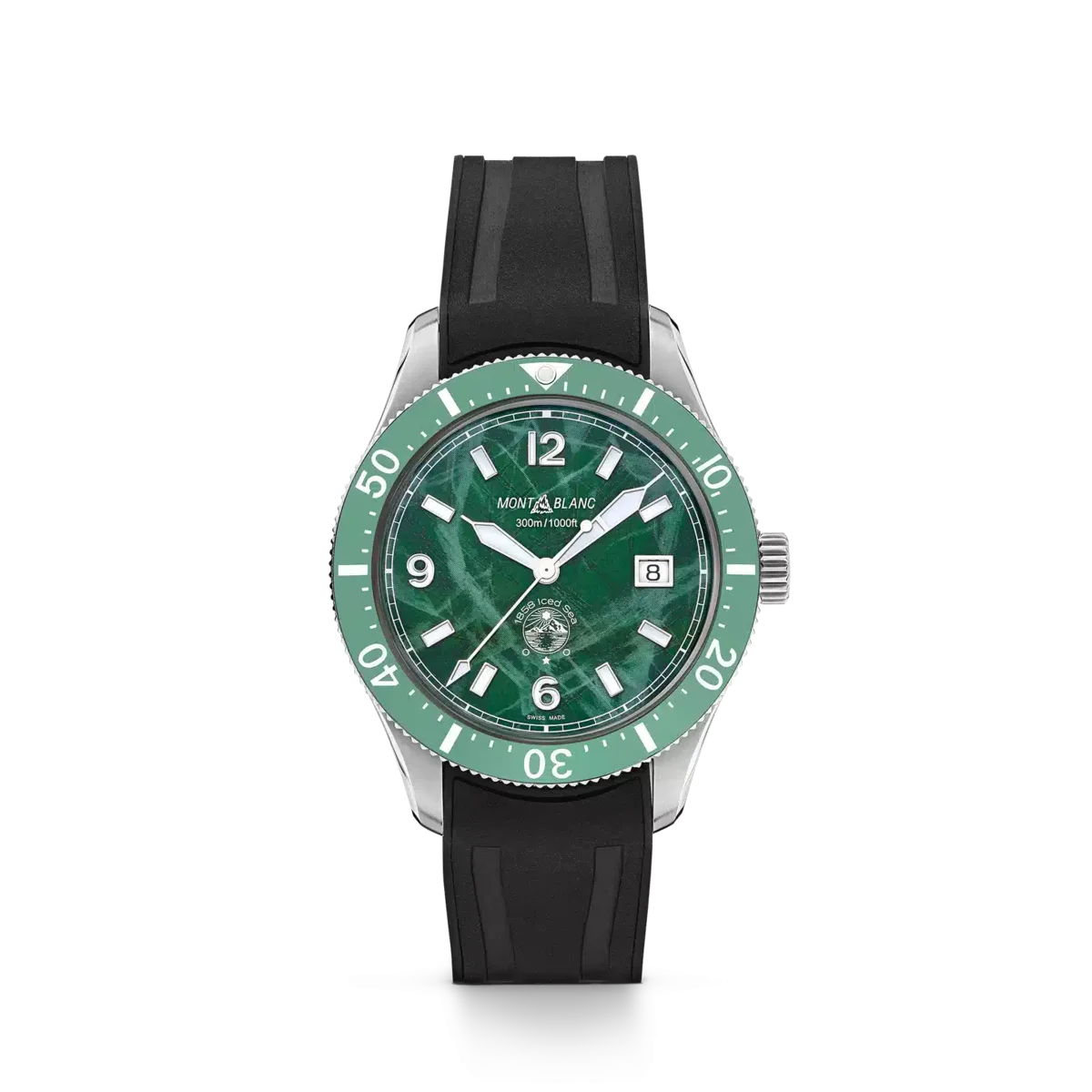 Die Montblanc Iced Sea Automatic Date ist die erste Sporttauchuhr von Montblanc und verfügt über ein Zifferblatt mit Gletschermuster, das den Eindruck vermittelt, in die Tiefen eines Gletschers zu blicken. Dieses grüne Zifferblatt mit Gletschermuster ist vom Mer de Glace – dem Eismeer – dem Hauptgletscher des Mont-Blanc-Massivs inspiriert. Seine Textur wurde mit einer fast vergessenen traditionellen Technik namens „gratté-boisé” erzielt. Der Zeitmesser ist in einem 41-mm-Edelstahlgehäuse untergebracht und verfügt über eine einseitig drehbare zweifarbige Keramiklünette, einen gravierten Gehäuseboden und ein austauschbares schwarzes Kautschukarmband mit Feineinstellungssystem. Die Uhr entspricht der Norm ISO 6425 für Taucheruhren und ist bis 300 Meter wasserdicht. Ident-Nr. MB129765 Bandanstoßbreite 20 mm