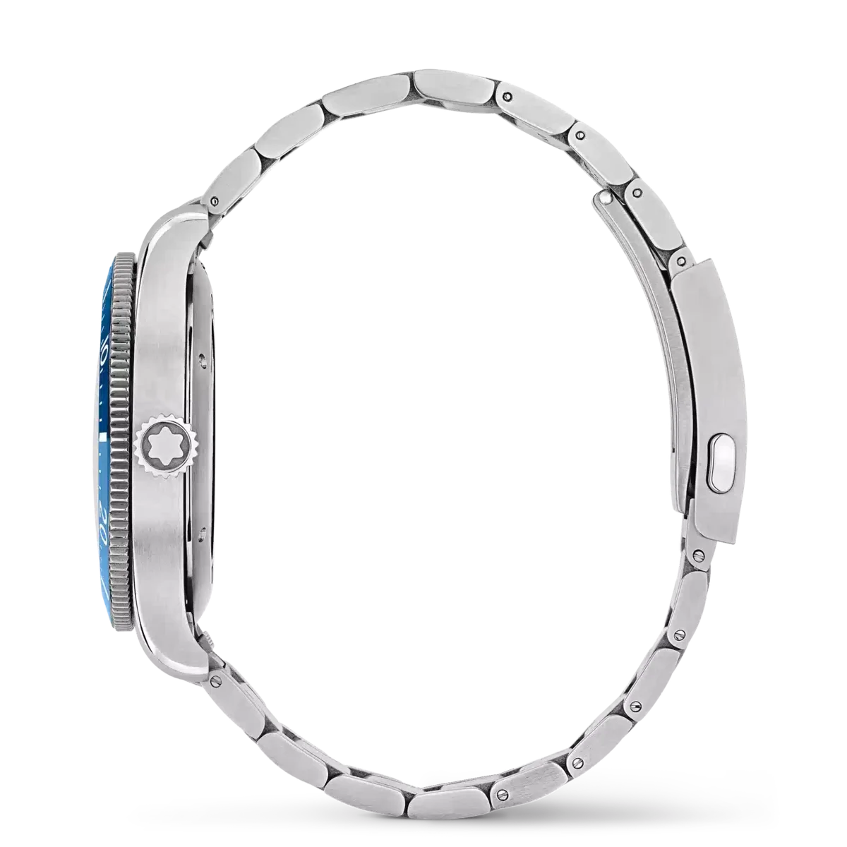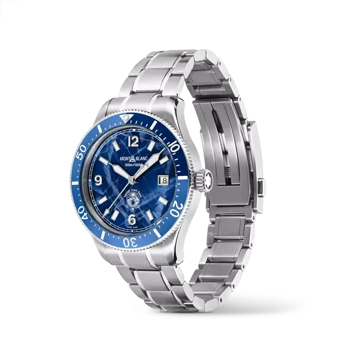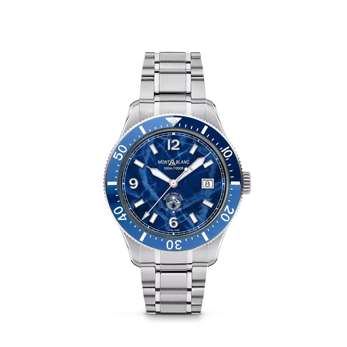 Die Montblanc Iced Sea Automatic Date ist die erste Sporttauchuhr von Montblanc und verfügt über ein Zifferblatt mit Gletschermuster, das den Eindruck vermittelt, in die Tiefen eines Gletschers zu blicken. Dieses blaue Zifferblatt mit Gletschermuster ist vom Mer de Glace – dem Eismeer – dem Hauptgletscher des Mont-Blanc-Massivs inspiriert. Seine Textur wurde mit einer fast vergessenen traditionellen Technik namens „gratté-boisé” erzielt. Die Uhr verfügt über ein 41-mm-Edelstahlgehäuse und ist mit einer einseitig drehbaren zweifarbigen Keramiklünette, einem gravierten Gehäuseboden und einem konischen, austauschbaren Edelstahlarmband mit Feineinstellung für präzisen Sitz ausgestattet. Die Uhr entspricht der Norm ISO 6425 für Taucheruhren und ist bis 300 Meter wasserdicht. Ident-Nr. MB129369