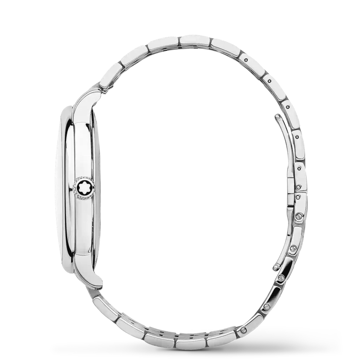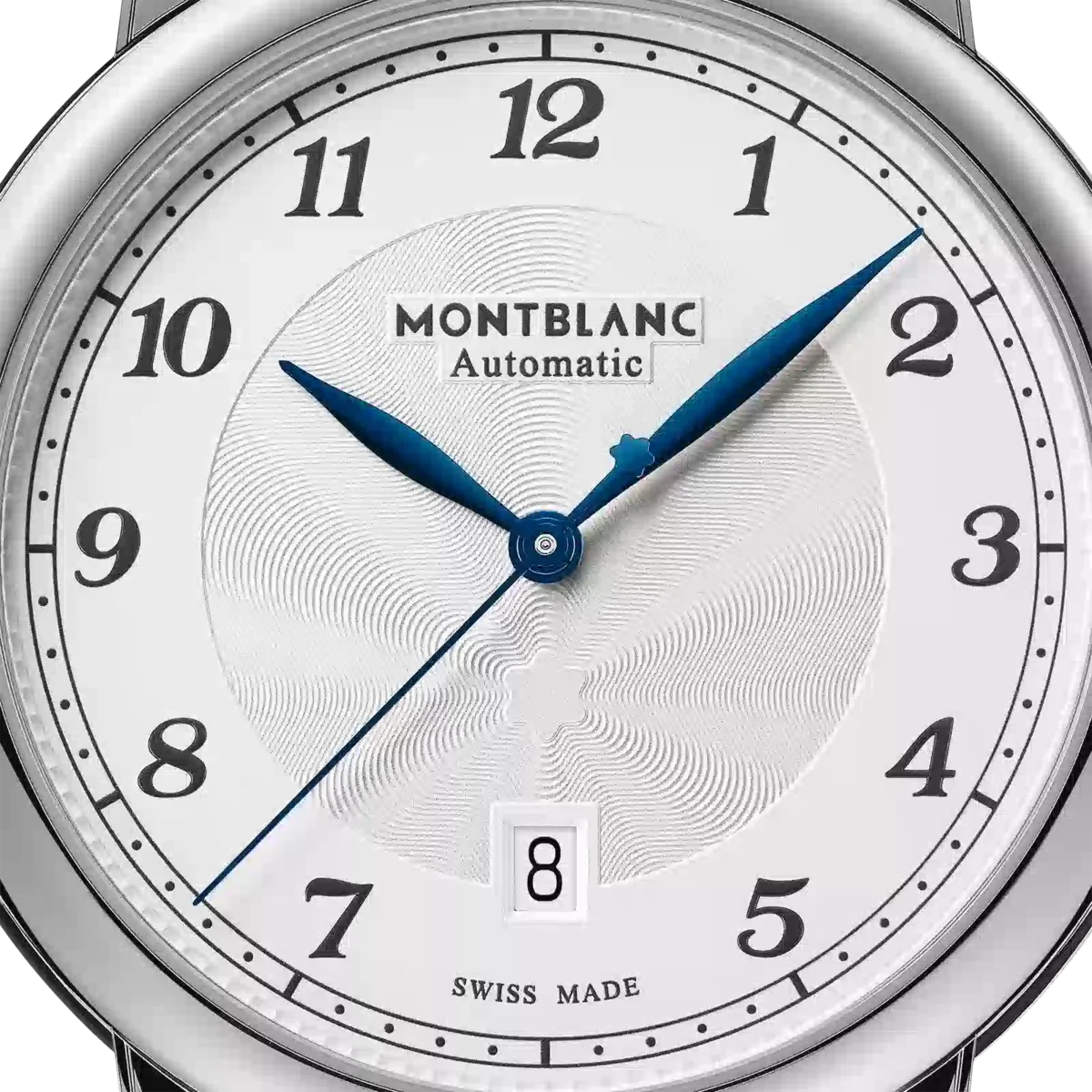 Die Montblanc Star Legacy Kollektion ist inspiriert vom Erbe von Minerva und den Taschenuhren des Unternehmens, die im späten 19. und frühen 20. Jahrhundert hergestellt wurden. Entsprechend den Designcodes der Produktlinie verfügt die Montblanc Star Legacy Automatic Date über ein raffiniertes silberweißes Zifferblatt mit dem Montblanc-Guilloché-Muster „Exploding Star“, arabischen Ziffern, blattförmigen Zeigern, einem „Filet Sauté“-Guilloché-Motiv und einer Eisenbahnminuterie. Die Uhr ist mit dem Automatikwerk MB 24.17 ausgestattet und verfügt über eine Stunden-, Minuten- und Sekundenanzeige in der Mitte sowie eine Datumsanzeige in einem Fenster bei 6 Uhr. Sie wird in einem 42-mm-Edelstahlgehäuse geliefert und ist mit einem Edelstahlarmband ausgestattet. Ident-Nr. MB128682