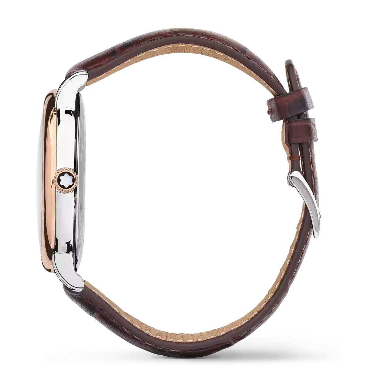 Die Montblanc Star Legacy Kollektion ist inspiriert vom Erbe von Minerva und den Taschenuhren des Unternehmens, die im späten 19. und frühen 20. Jahrhundert hergestellt wurden. Entsprechend den Designvorgaben der Produktlinie verfügt die Montblanc Star Legacy Automatic Date über ein raffiniertes silberweißes Zifferblatt mit dem Montblanc-Guilloché-Muster „Exploding Star“, arabischen Ziffern, blattförmigen Zeigern, einem „Filet Sauté“-Guilloché-Motiv und einer Eisenbahnminuterie. Die Uhr ist mit dem Automatikwerk MB 24.17 ausgestattet und verfügt über eine Stunden-, Minuten- und Sekundenanzeige in der Mitte sowie eine Datumsanzeige in einem Fenster bei 6 Uhr. Sie wird in einem 42-mm-Edelstahlgehäuse mit einer Lünette aus 750/1000 Roségold (18 Karat) geliefert und ist mit einem braunen Kalbslederarmband mit Alligatorprägung ausgestattet.