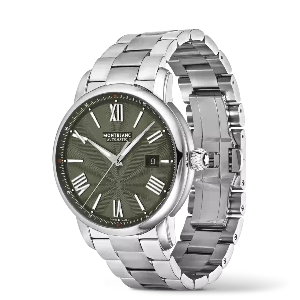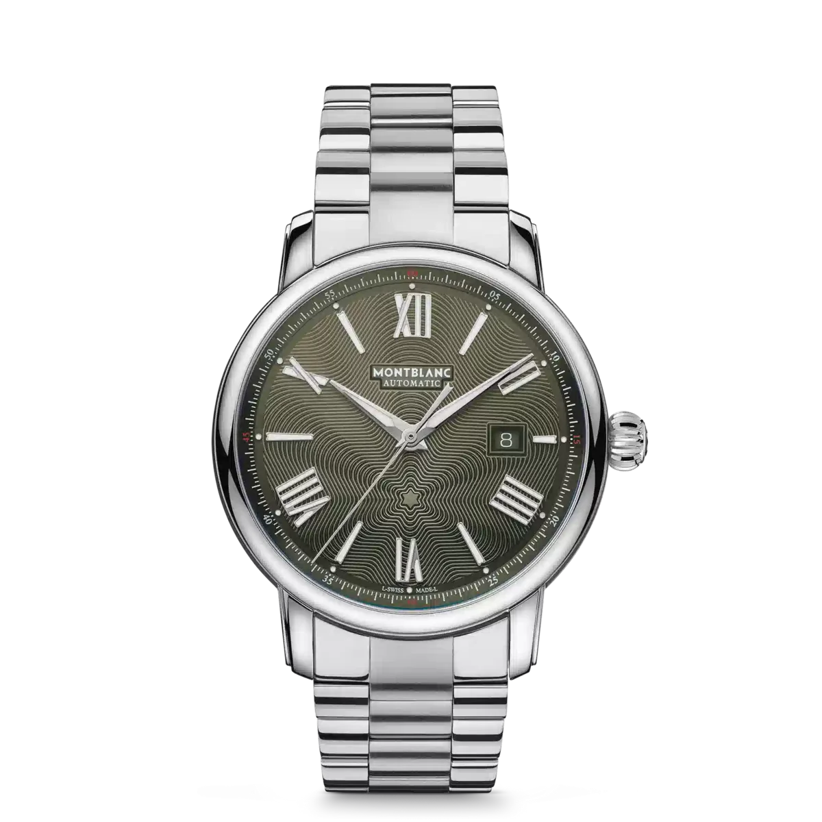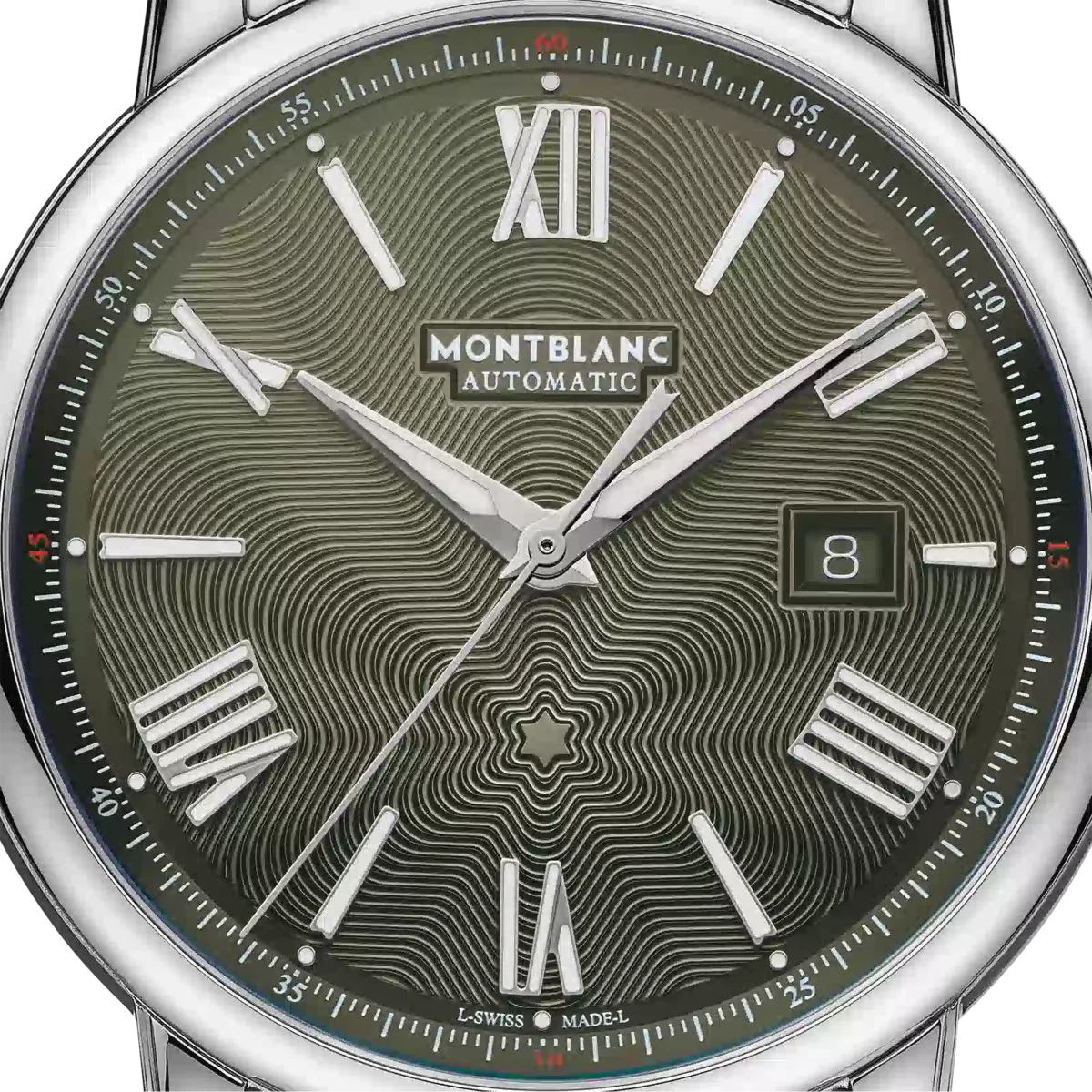 Die Montblanc Star Legacy Automatic Date Limited Edition mit einer Auflage von 800 Stück ist mit einem grünen Zifferblatt mit dem charakteristischen Exploding-Star-Muster von Montblanc sowie rhodinierten schwertförmigen Zeigern und Ziffern verziert. Sie wird von einem Automatikwerk MB 24.17 angetrieben, das die Stunden, Minuten, Sekunden und das Datum anzeigt. Das Design der Uhr ist von den Minerva-Taschenuhren aus dem späten 19. und frühen 20. Jahrhundert inspiriert, mit ihren runden, polierten, kieselsteinförmigen Gehäusen und zwiebelförmigen Kronen. Diese Uhr ist außerdem mit einem austauschbaren Edelstahlarmband ausgestattet. Ident-Nr. MB132949