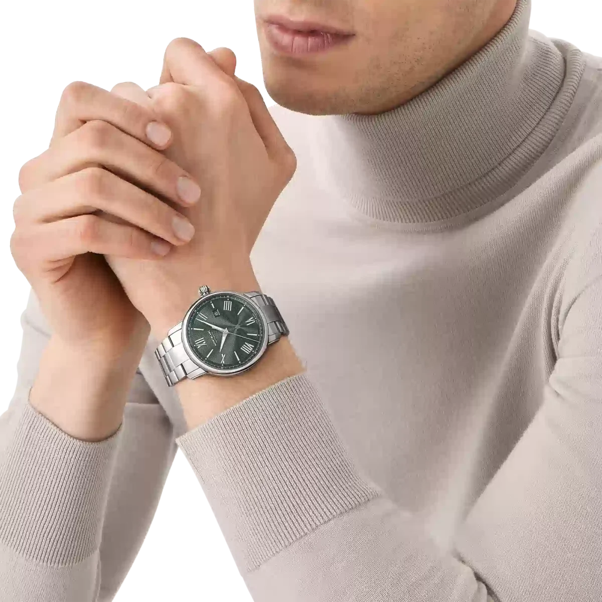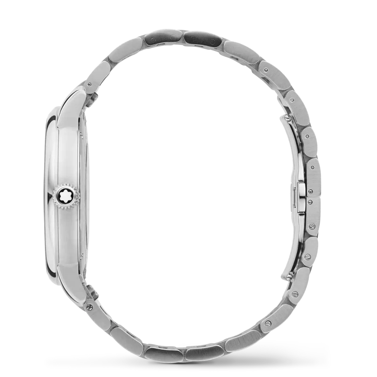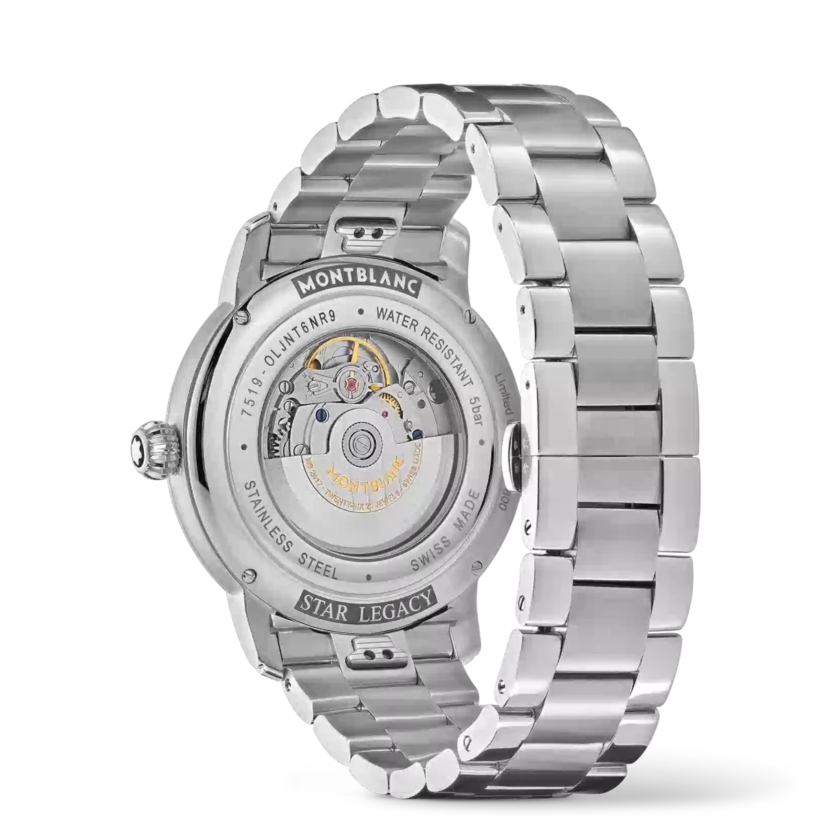 Die Montblanc Star Legacy Automatic Date Limited Edition mit einer Auflage von 800 Stück ist mit einem grünen Zifferblatt mit dem charakteristischen Exploding-Star-Muster von Montblanc sowie rhodinierten schwertförmigen Zeigern und Ziffern verziert. Sie wird von einem Automatikwerk MB 24.17 angetrieben, das die Stunden, Minuten, Sekunden und das Datum anzeigt. Das Design der Uhr ist von den Minerva-Taschenuhren aus dem späten 19. und frühen 20. Jahrhundert inspiriert, mit ihren runden, polierten, kieselsteinförmigen Gehäusen und zwiebelförmigen Kronen. Diese Uhr ist außerdem mit einem austauschbaren Edelstahlarmband ausgestattet. Ident-Nr. MB132949