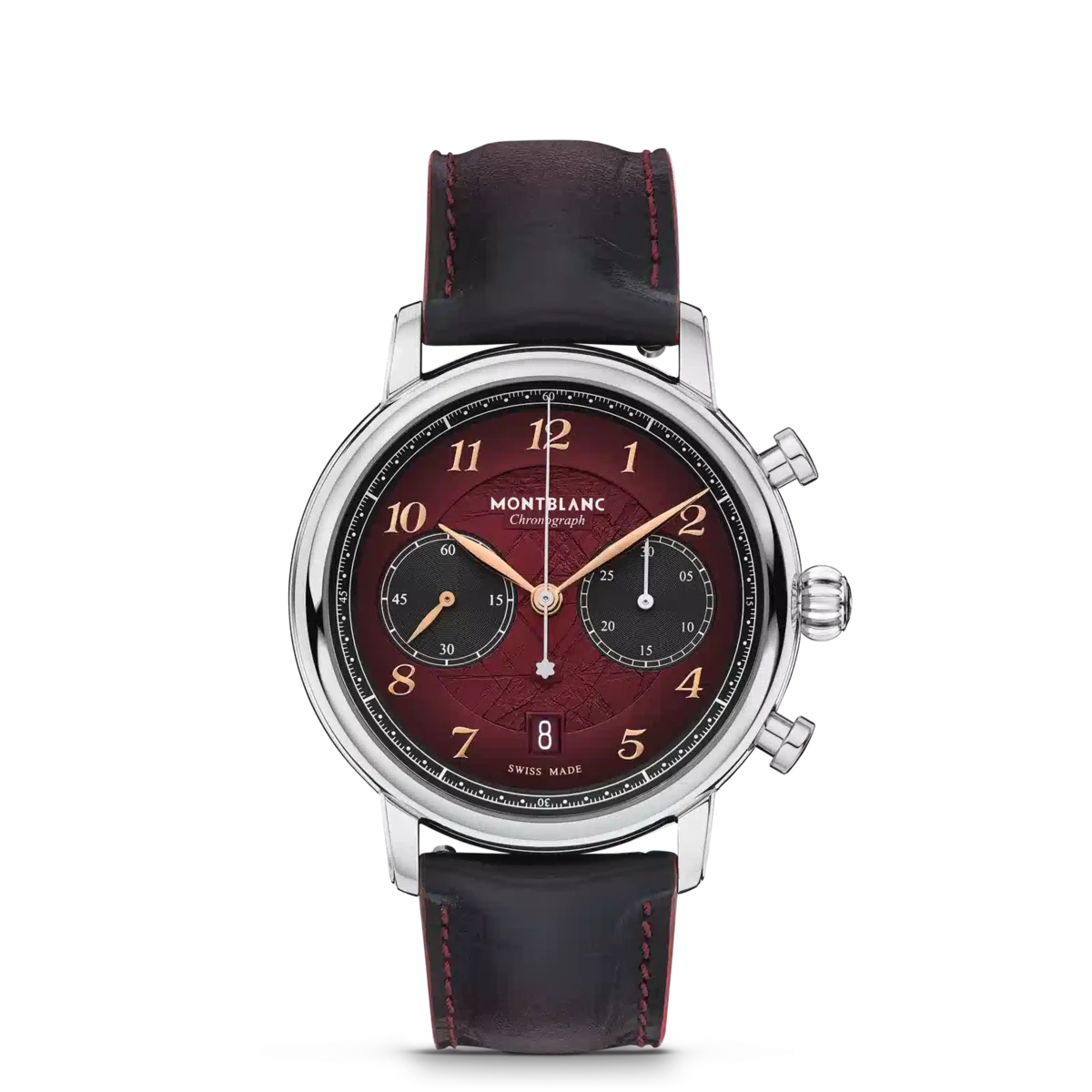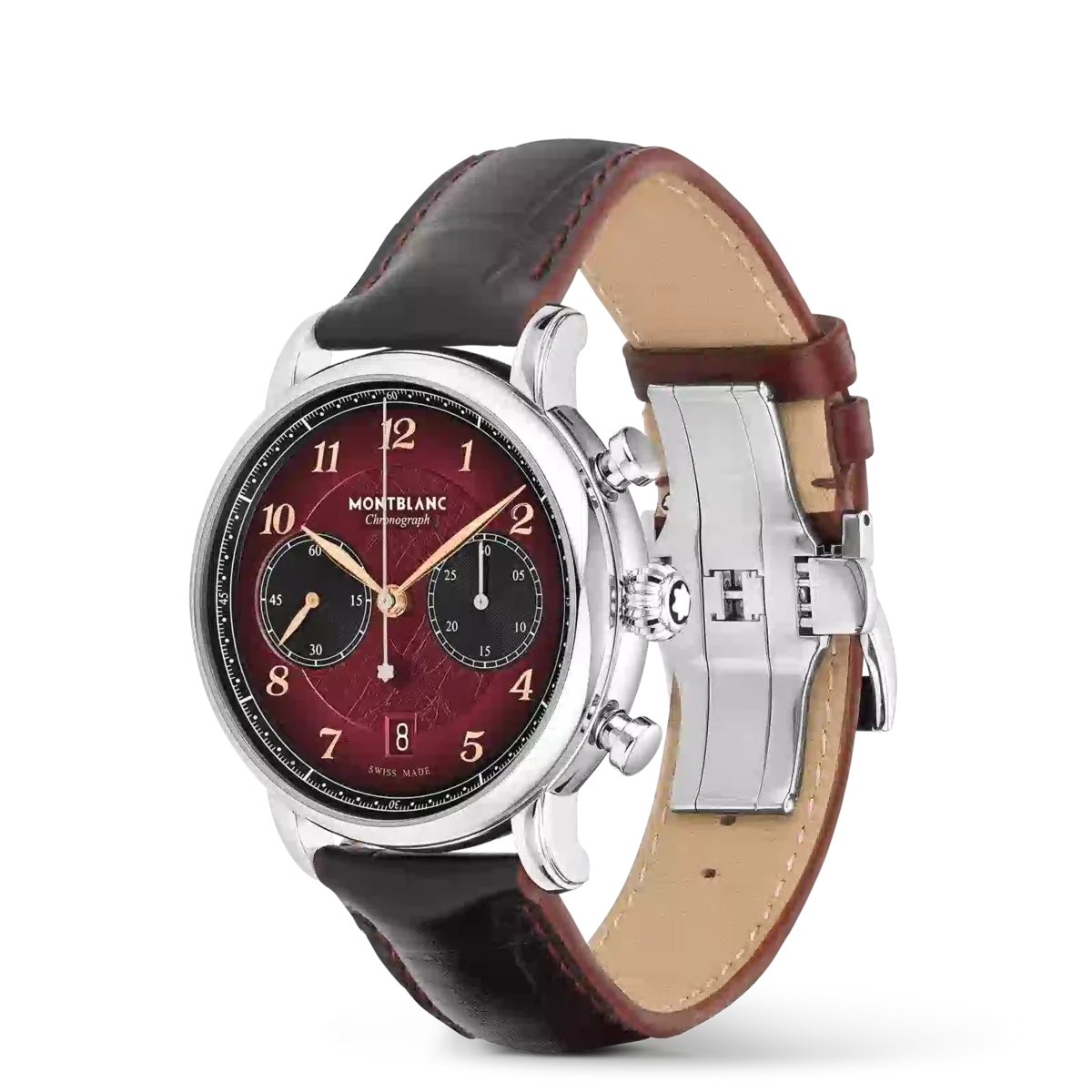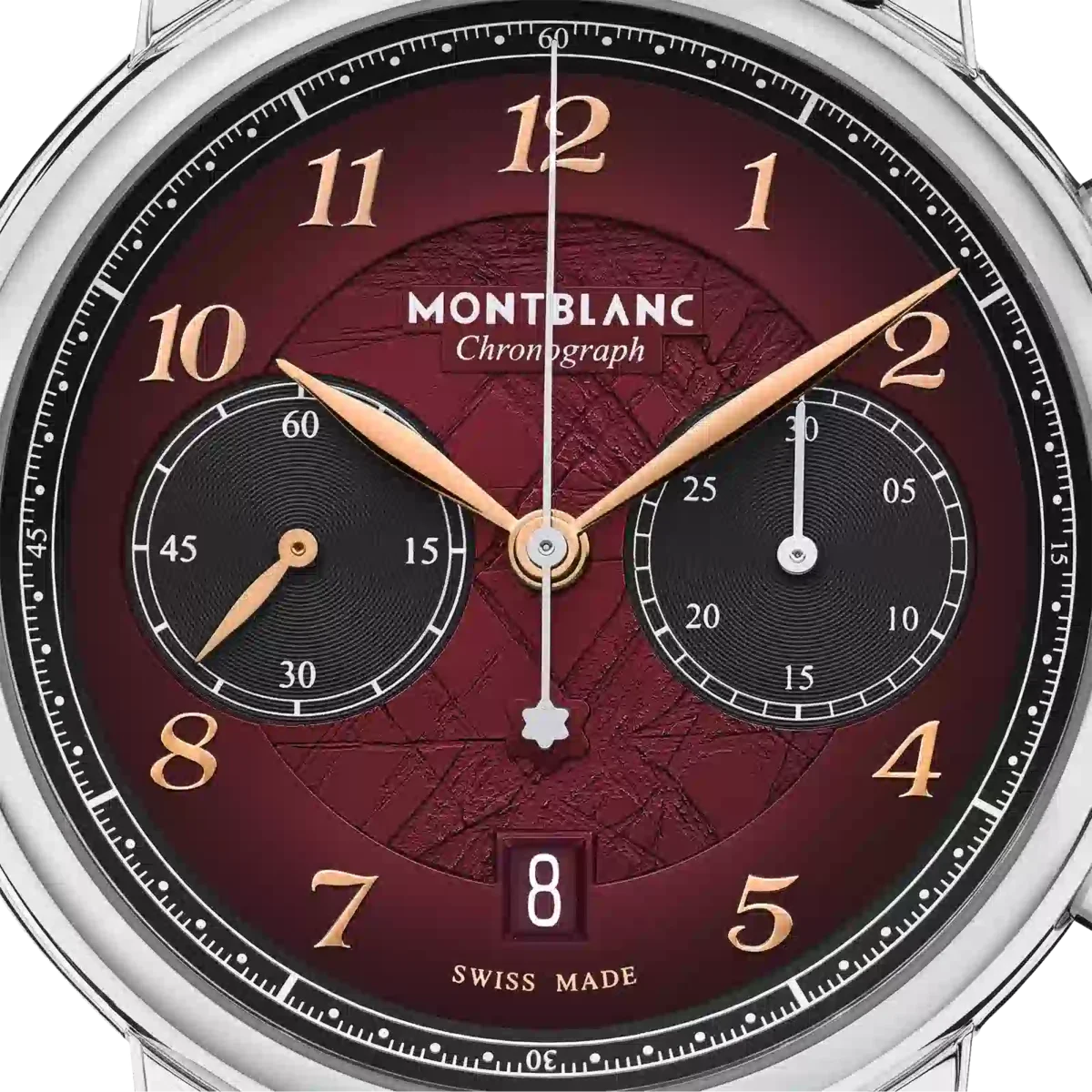 Die Montblanc Star Legacy Chronograph Limited Edition mit einer Auflage von 1786 Stück ist eine Hommage an den unerschrockenen Jacques Balmat, der 1786 als erster den Gipfel des Mont Blanc bestieg. Der Zeitmesser verfügt über ein burgunderfarbenes Zifferblatt mit Gletschermuster und einem Sfumato-Effekt am Rand, eine Rack-Minuterie und roségoldbeschichtete Ziffern. Zu den Anzeigen gehören ein zentraler Chronographenzeiger mit Montblanc-Emblem auf dem Gegengewicht und ein 30-Minuten-Chronographenzähler mit rhodinierten Zeigern, während die Zeitmessfunktionen – Stunden, Minuten und kleine Sekunde – mit rosévergoldeten Zeigern ausgestattet sind. Dieses Modell wird vom Automatikwerk MB 25.13 angetrieben und befindet sich in einem 42-mm-Edelstahlgehäuse mit offenem Gehäuseboden auf dem Uhrwerk. Die Uhr wird mit einem austauschbaren Kalbslederarmband mit Alligatorprägung und vertikalem Sfumato geliefert. Ident-Nr. MB133245 Bandanstoßbreite 21 mm