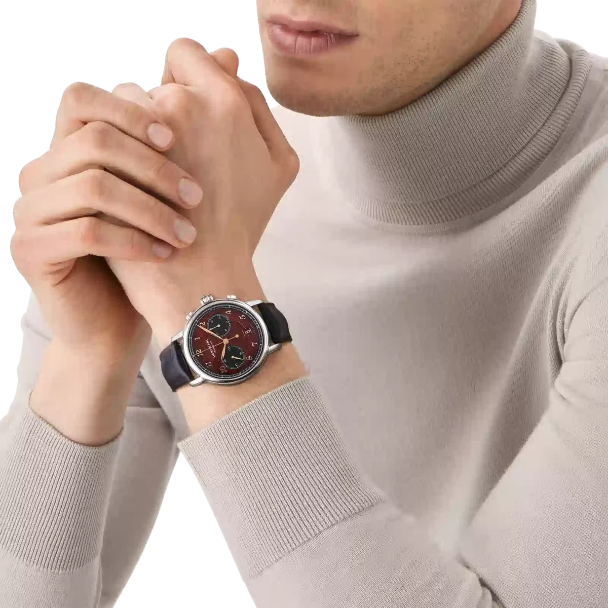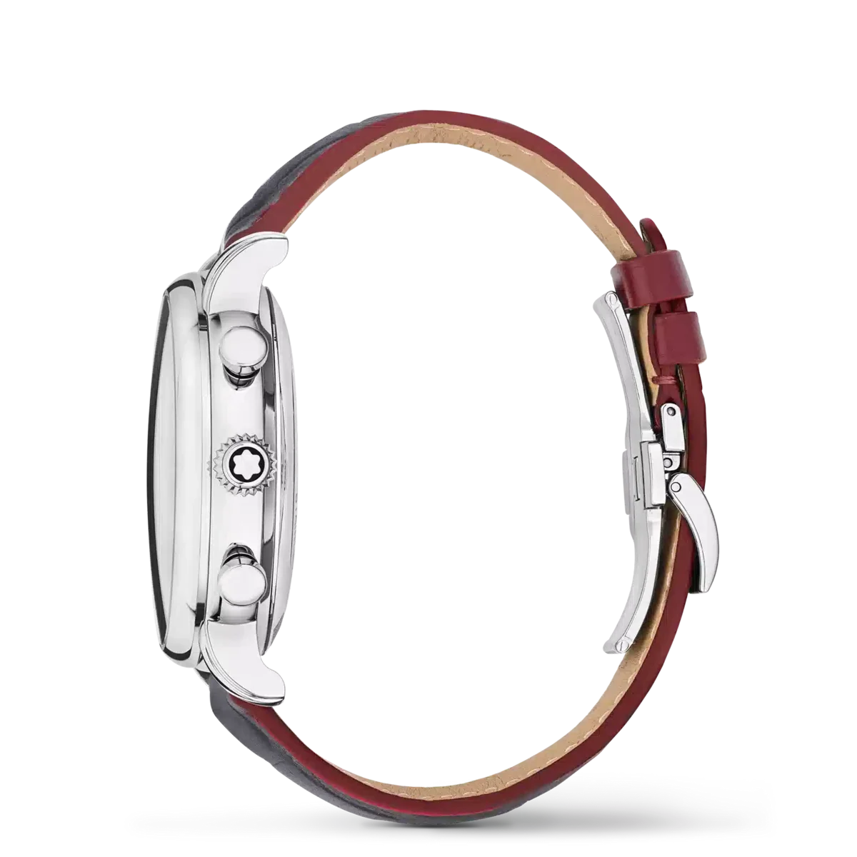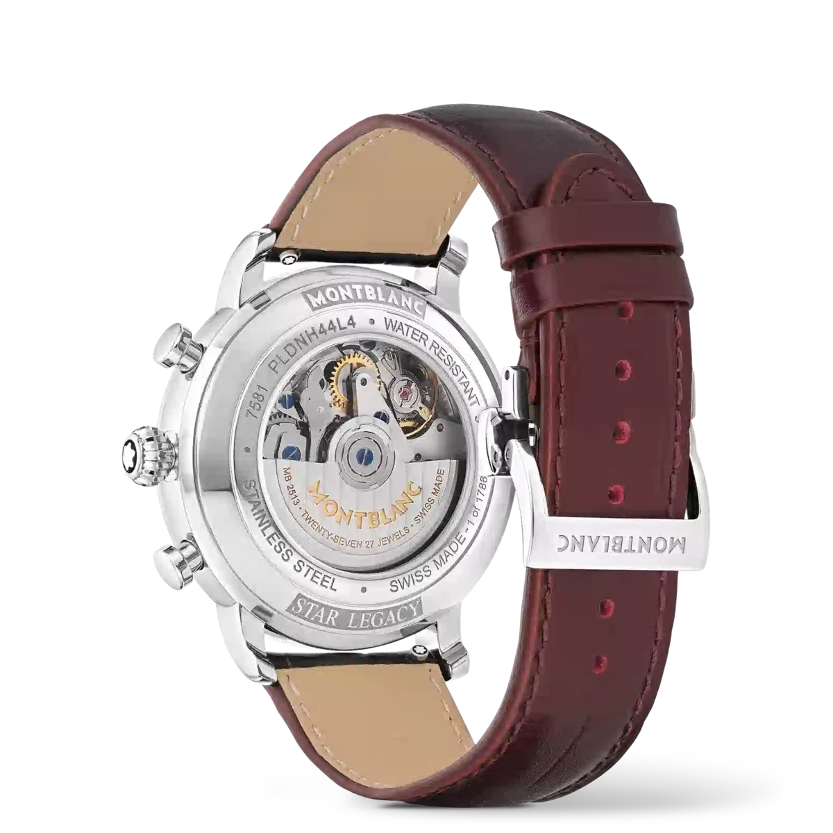 Die Montblanc Star Legacy Chronograph Limited Edition mit einer Auflage von 1786 Stück ist eine Hommage an den unerschrockenen Jacques Balmat, der 1786 als erster den Gipfel des Mont Blanc bestieg. Der Zeitmesser verfügt über ein burgunderfarbenes Zifferblatt mit Gletschermuster und einem Sfumato-Effekt am Rand, eine Rack-Minuterie und roségoldbeschichtete Ziffern. Zu den Anzeigen gehören ein zentraler Chronographenzeiger mit Montblanc-Emblem auf dem Gegengewicht und ein 30-Minuten-Chronographenzähler mit rhodinierten Zeigern, während die Zeitmessfunktionen – Stunden, Minuten und kleine Sekunde – mit rosévergoldeten Zeigern ausgestattet sind. Dieses Modell wird vom Automatikwerk MB 25.13 angetrieben und befindet sich in einem 42-mm-Edelstahlgehäuse mit offenem Gehäuseboden auf dem Uhrwerk. Die Uhr wird mit einem austauschbaren Kalbslederarmband mit Alligatorprägung und vertikalem Sfumato geliefert. Ident-Nr. MB133245 Bandanstoßbreite 21 mm