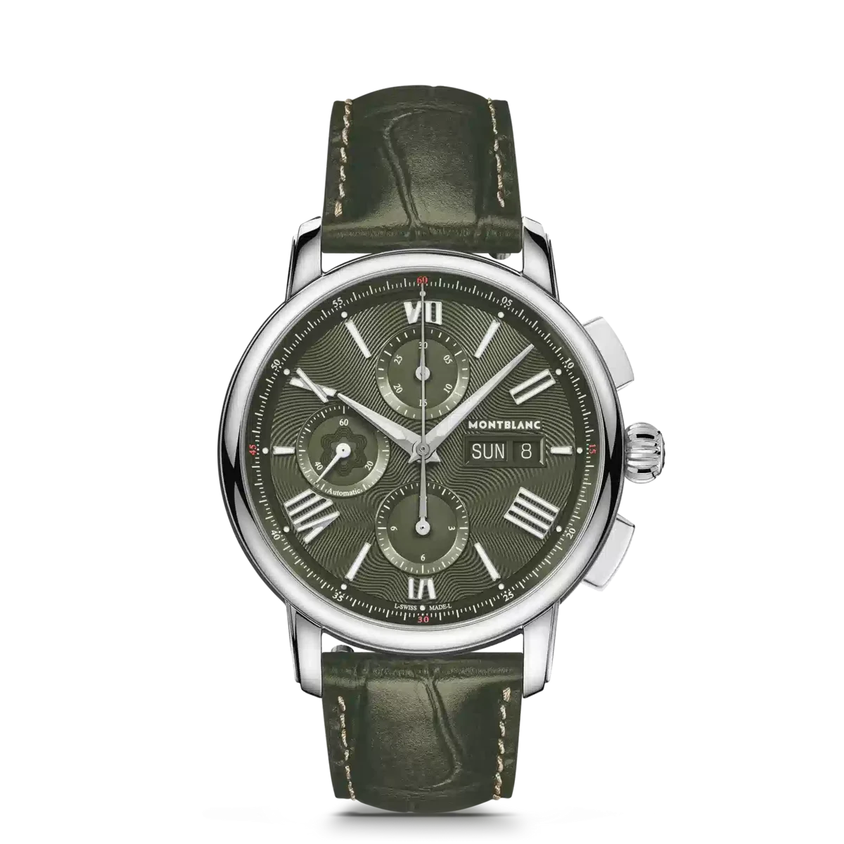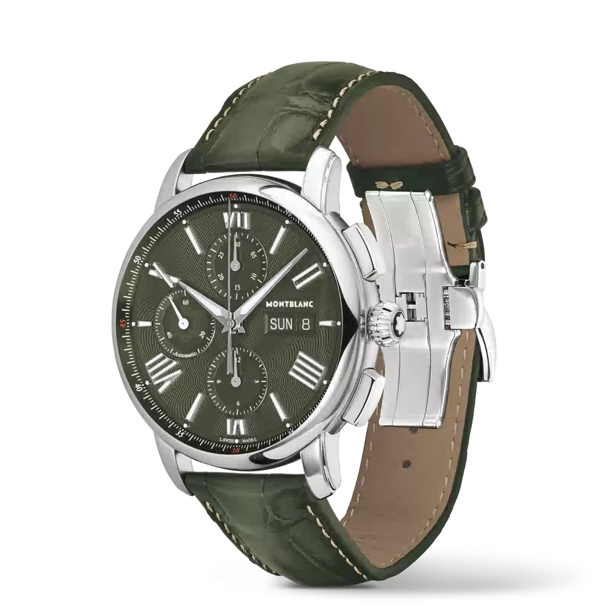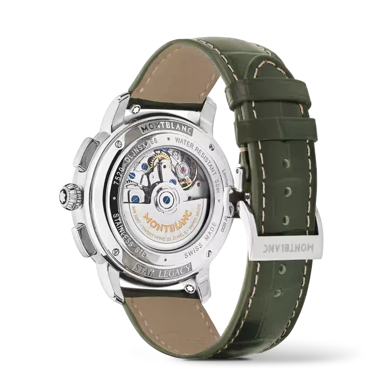 Der Montblanc Star Legacy Chronograph Day & Date Limited Edition in einer Auflage von 800 Stück ist von den Minerva-Taschenuhren aus dem späten 19. und frühen 20. Jahrhundert mit ihren runden, polierten, kieselsteinförmigen Gehäusen und zwiebelförmigen Kronen inspiriert. Das wunderschöne grüne Zifferblatt ist mit dem charakteristischen Exploding-Star-Muster von Montblanc sowie rhodinierten, schwertförmigen Zeigern und Ziffern versehen. Angetrieben wird die Uhr vom Automatikwerk MB 25.07, das über eine Chronographenfunktion, eine Wochentagsanzeige und eine Datumsanzeige verfügt. Diese Uhr ist außerdem mit einem austauschbaren grünen Kalbslederarmband mit Alligatorprägung und ecrufarbenen Nähten ausgestattet.