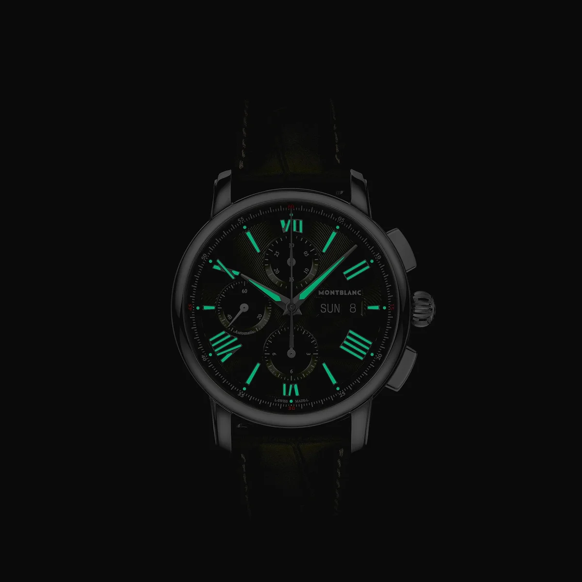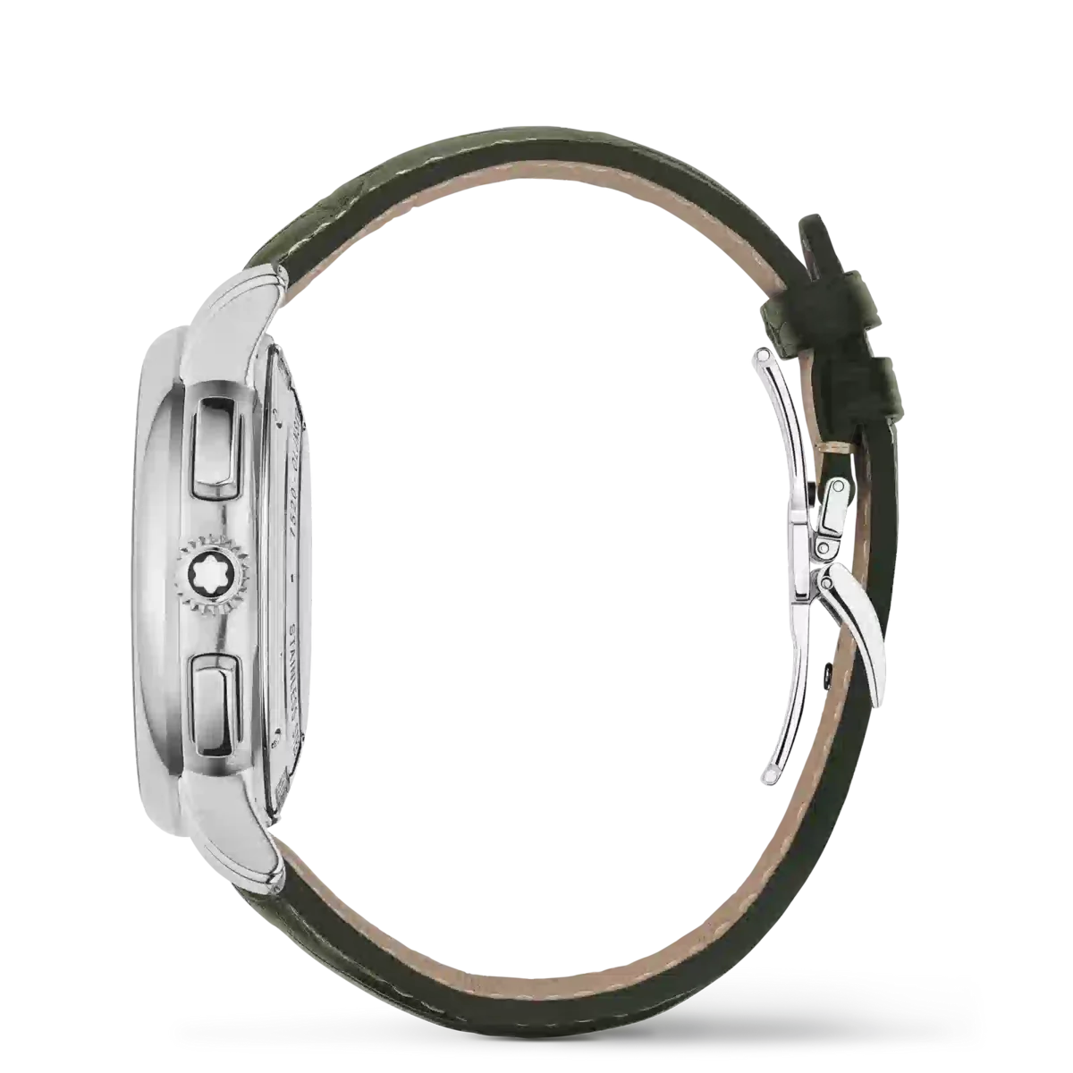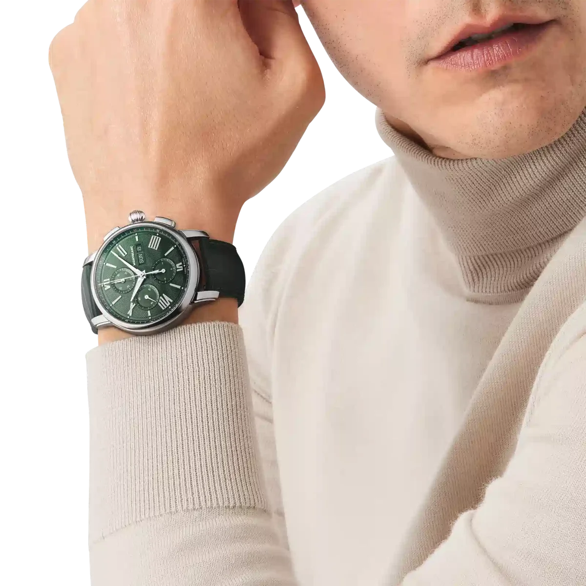 Der Montblanc Star Legacy Chronograph Day & Date Limited Edition in einer Auflage von 800 Stück ist von den Minerva-Taschenuhren aus dem späten 19. und frühen 20. Jahrhundert mit ihren runden, polierten, kieselsteinförmigen Gehäusen und zwiebelförmigen Kronen inspiriert. Das wunderschöne grüne Zifferblatt ist mit dem charakteristischen Exploding-Star-Muster von Montblanc sowie rhodinierten, schwertförmigen Zeigern und Ziffern versehen. Angetrieben wird die Uhr vom Automatikwerk MB 25.07, das über eine Chronographenfunktion, eine Wochentagsanzeige und eine Datumsanzeige verfügt. Diese Uhr ist außerdem mit einem austauschbaren grünen Kalbslederarmband mit Alligatorprägung und ecrufarbenen Nähten ausgestattet.