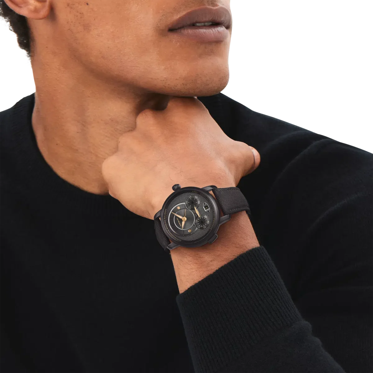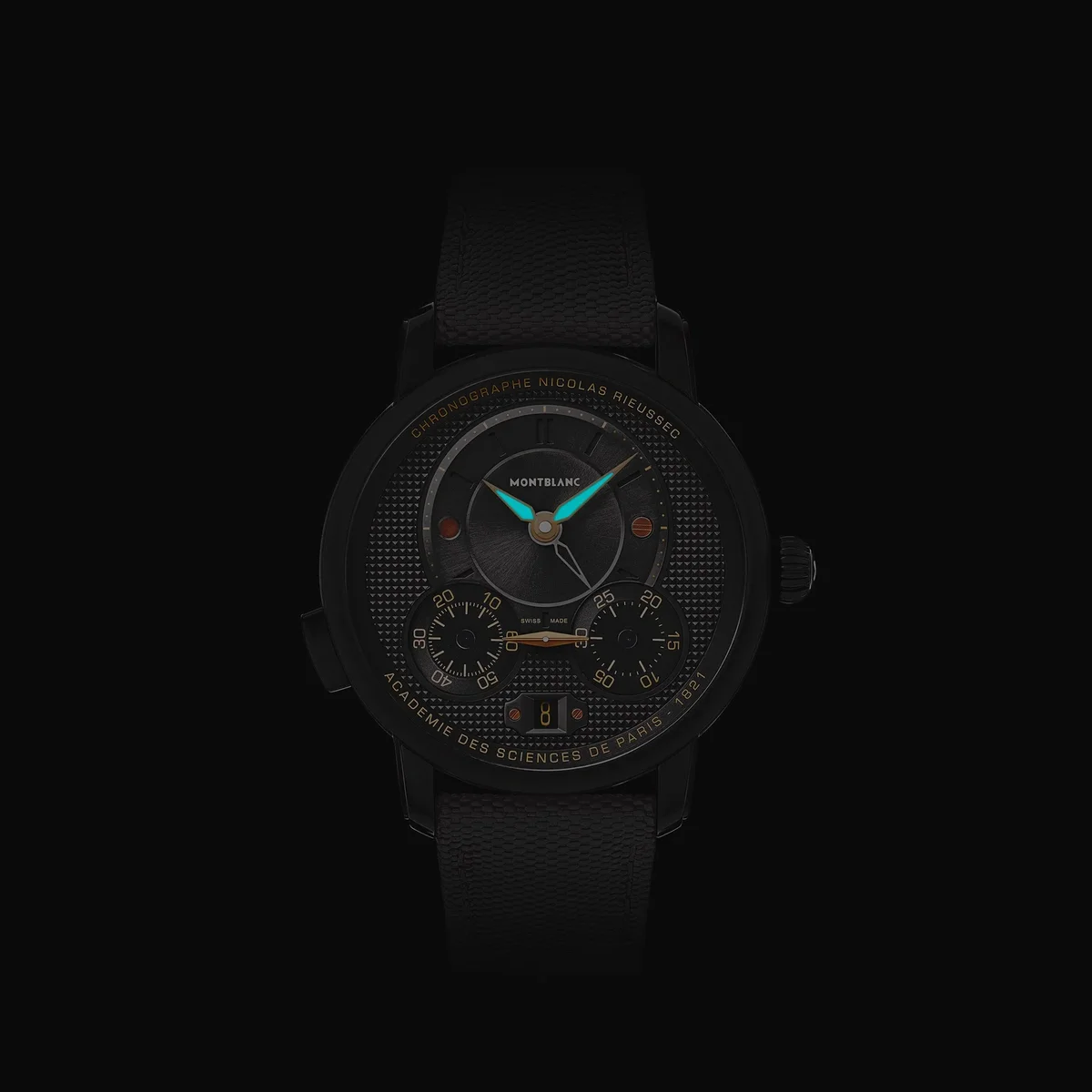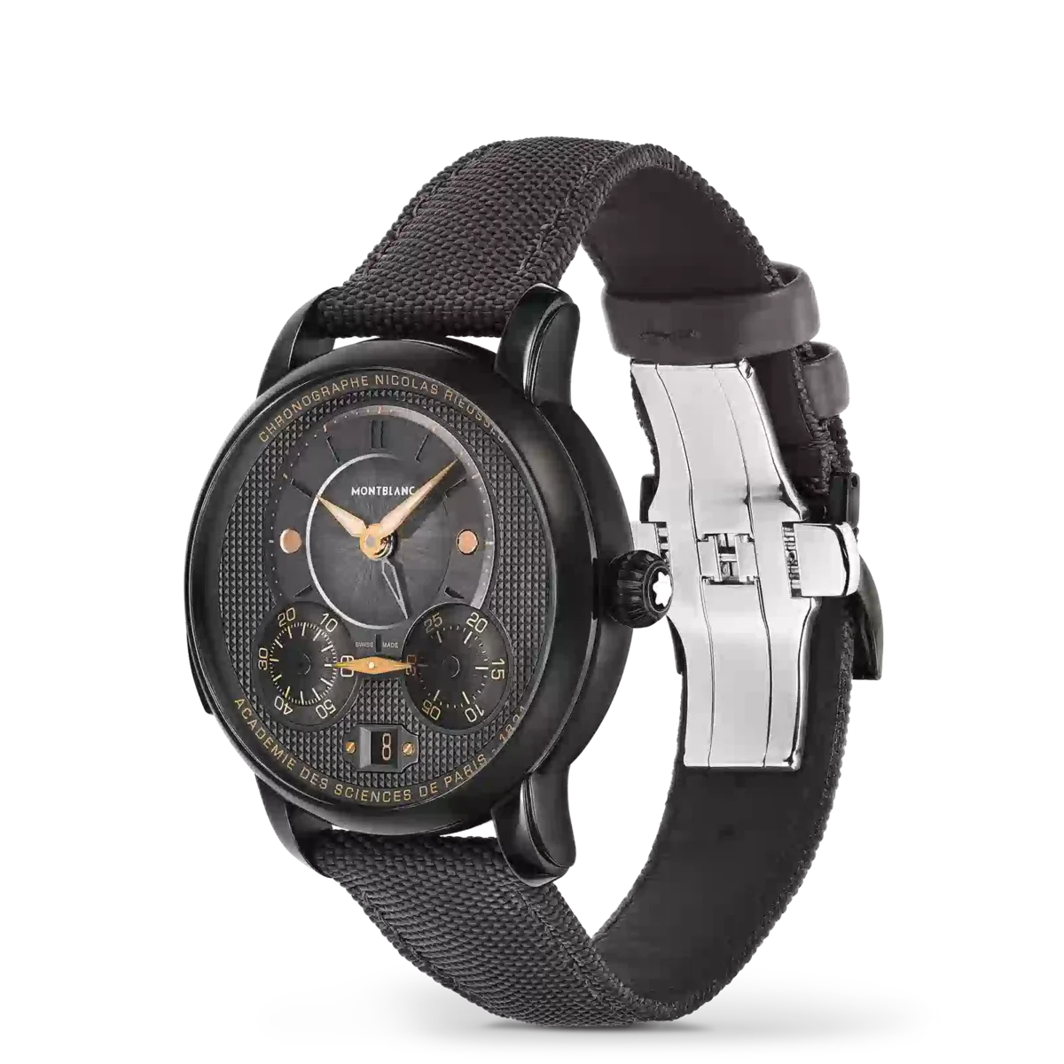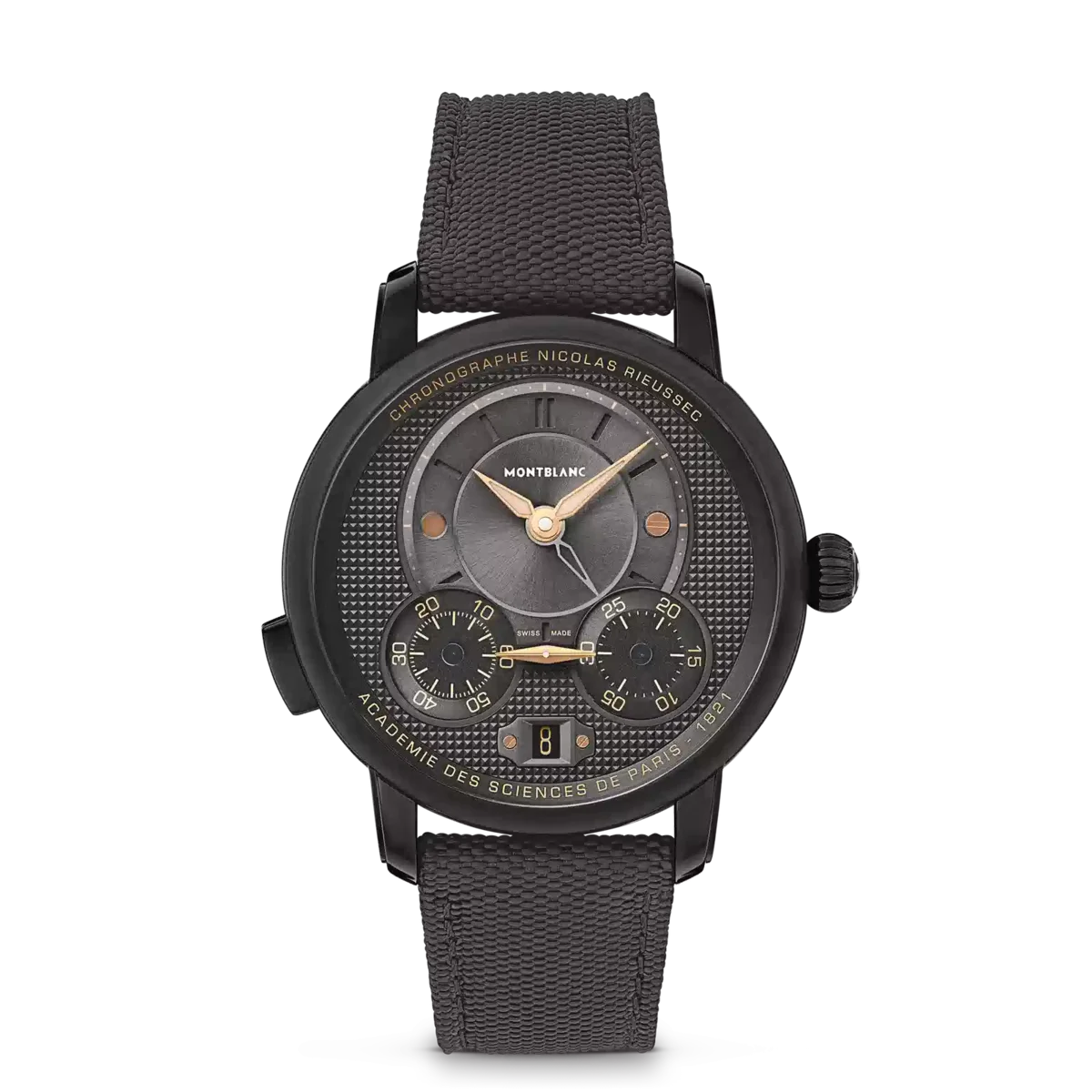 Der Montblanc Star Legacy Nicolas Rieussec Monopusher Chronograph Limited Edition mit einer Auflage von 500 Stück wird vom Manufakturwerk MB R200 angetrieben und verfügt über ein 43-mm-Edelstahlgehäuse mit schwarzer DLC-Beschichtung, anthrazitfarbenem Zifferblatt, roségoldbeschichteten Zeigern und schwarzen Indizes. Dieses neue Modell weist mehrere Details auf, die die historische Verbindung zu Paris unterstreichen – wo die Geschichte der Montblanc-Chronographen auf der Pferderennbahn Champ-de-Mars begann –, darunter ein Clou-de-Paris-Motiv auf dem Zifferblatt, das sich auf der Schwungmasse und dem Textilarmband fortsetzt. Dieses Motiv stammt aus dem geometrischen Design der gepflasterten Straßen von Paris und ist das Bindeglied zwischen der Vergangenheit und der Zukunft dieser Uhr.