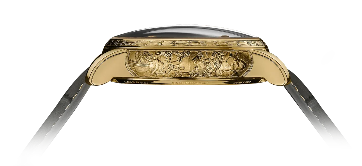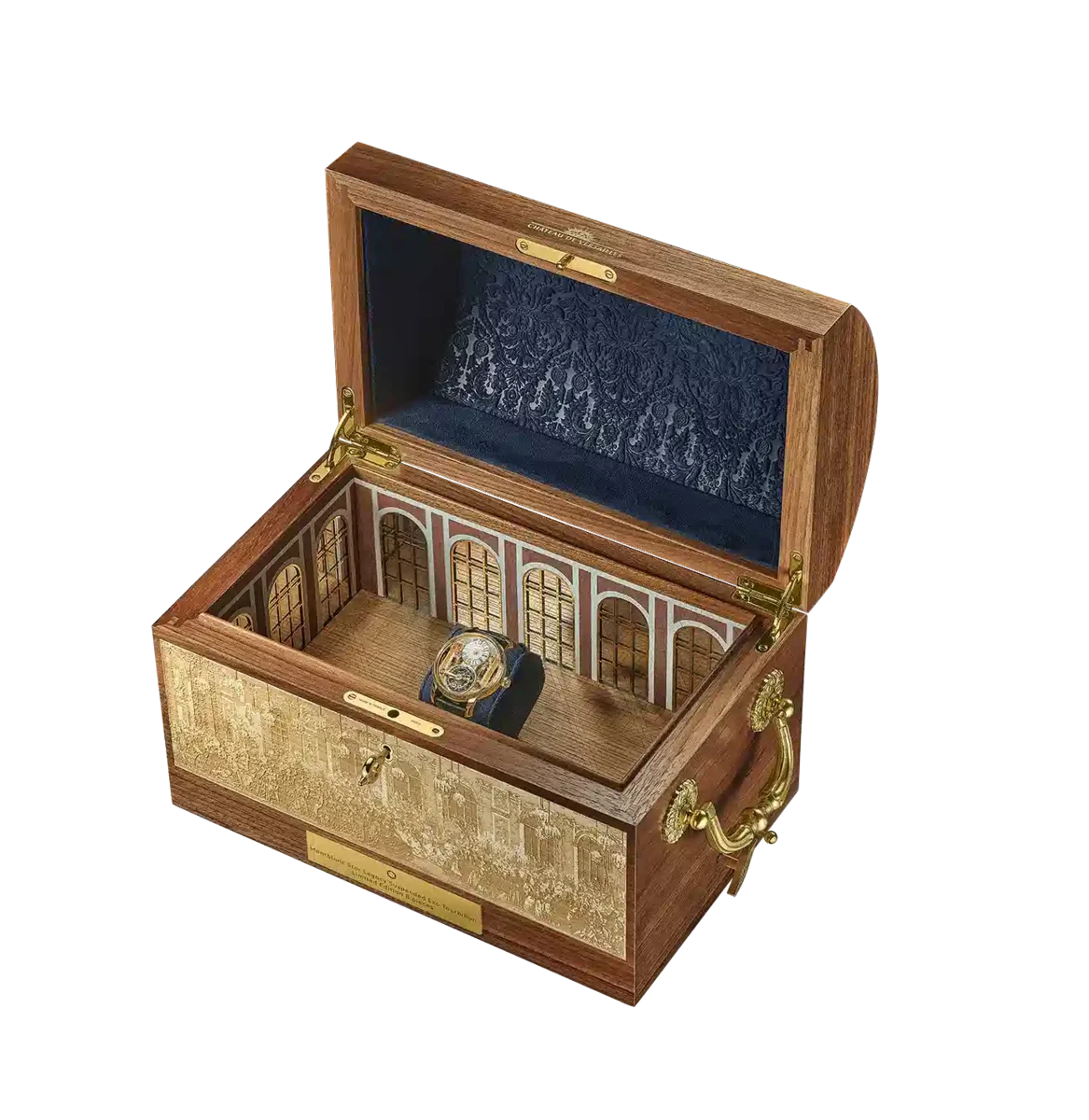 Erleben Sie mit der Montblanc Star Legacy Suspended Exo Tourbillon Château de Versailles „Le Secret du Bal des Ifs“ noch einmal den großen Maskenball, den Ludwig XV. 1745 im berühmten Spiegelsaal von Versailles veranstaltete. Dieser außergewöhnliche Zeitmesser vereint traditionelle Haute Horlogerie, Intarsien, Handgravur und Champlevé-Emaille mit digitaler 3D-Modellierung und Lasergravur. Das Hauptzifferblatt bildet den berühmten „Yew Tree Ball” nach, mit einer Basis aus 750/1000 Weißgold (18 Karat), die mit schwarzem Emaille und Goldpaillons bedeckt ist und an die Reflexionen der kerzenbeleuchteten Kronleuchter in den Fenstern des Spiegelsaals erinnert. Die Bögen bestehen aus Cacholong-Stein und Sarrancolin-Marmor aus demselben Steinbruch in den französischen Hautes-Pyrénées, der auch in Versailles verwendet wurde. Der Parkettboden wurde originalgetreu aus massiver Eiche nachgebildet. Die Kronleuchter und kostümierten Gäste sind auf einer Saphirplatte graviert, die über dem Hauptzifferblatt angebracht ist. Inspiriert von Uhren aus der Zeit Ludwigs XIV. erinnert das Zifferblatt bei 12 Uhr mit Champlevé-Email und einem gravierten Ring aus 750/1000 Gelbgold (18 Karat) an die Traditionen der Haute Horlogerie, während die skelettierten Zeiger aus 750/1000 Gelbgold (18 Karat) mit dem Kopf des Apollo gekrönt sind. Das Gehäuse aus 750/1000 Gelbgold (18 Karat) ist mit einem handgravierten Lorbeerkranz auf der Lünette und einer Szene mit Minerva und Merkur auf dem Gehäusemittelteil verziert, die ein Gemälde aus dem Salon de la Paix – einem Raum neben dem Spiegelsaal – nachbildet. Dieser Zeitmesser wird vom Manufakturkaliber MB M16.68 mit der patentierten Komplikation Suspended Exo Tourbillon angetrieben, deren Entwicklung drei Jahre in Anspruch nahm. Das austauschbare graue Kalbslederarmband mit Alligatorprägung und die dreifache Faltschließe aus 750/1000 Gelbgold (18 Karat) runden diesen außergewöhnlichen Zeitmesser ab. Die Montblanc Star Legacy Exo Tourbillon Château de Versailles ist auf 8 Stück limitiert: „Le Secret du Bal des Ifs” wird in einem Etui aus Walnussholz geliefert, das eine Spieluhr enthält, die eine Melodie aus einer Comédie-Ballet von Jean-Philippe Rameau spielt. Ein bezauberndes Schauspiel auf einem Miniaturparkettboden, umgeben von Marmorarkaden, das an den Maskenball im Spiegelsaal von Versailles erinnert. Ident-Nr. MB134295