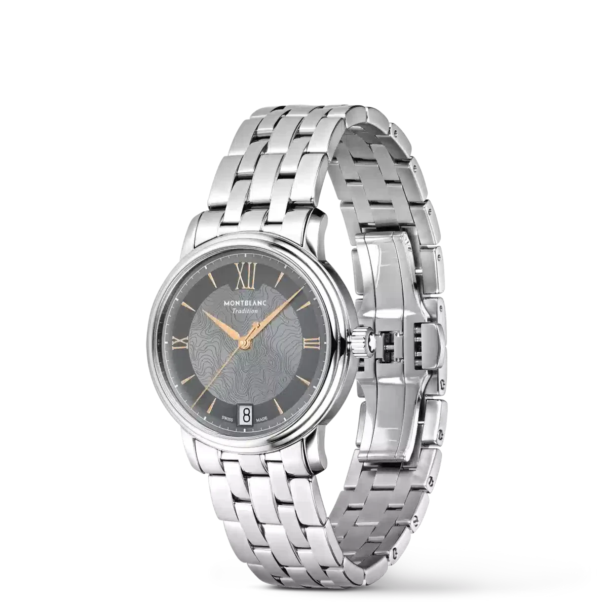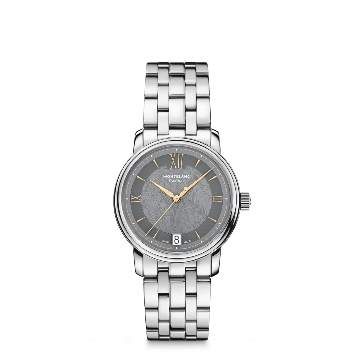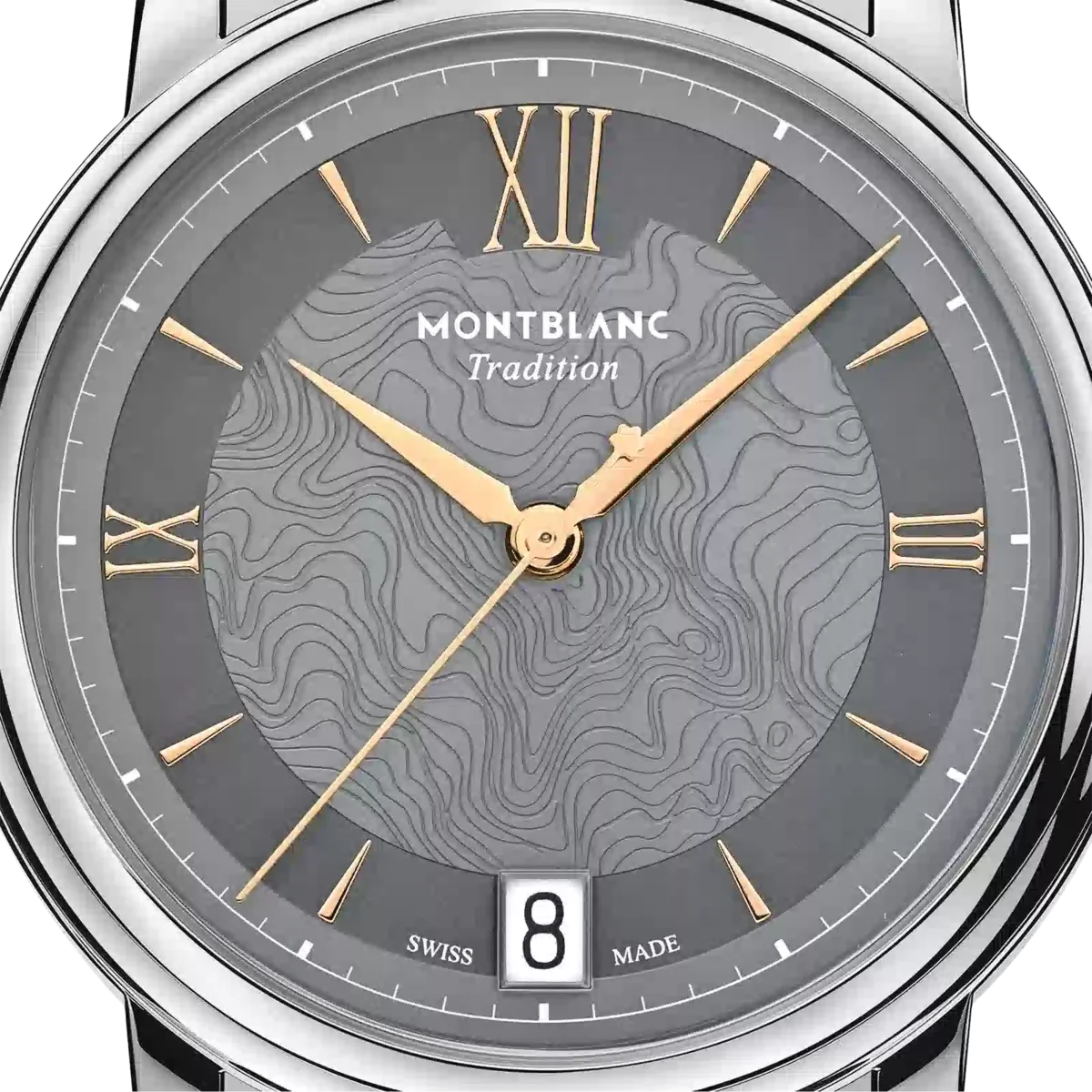 Die Montblanc Tradition Automatic Date verfügt über ein 32-mm-Edelstahlgehäuse mit geraden Bandanstößen und einer doppelt geformten Lünette. Der Zeitmesser verfügt über ein graues Zifferblatt, das die Topografie des Mont Blanc mit roségoldfarbenen römischen Ziffern und einer markanten römischen „XII” darstellt. Die schwertförmigen Stunden- und Minutenzeiger, der Sekundenzeiger und die Krone mit Montblanc Emblem sowie das austauschbare Edelstahlarmband runden das zeitgemäße, elegante Erscheinungsbild ab.