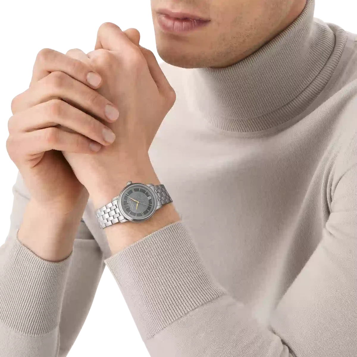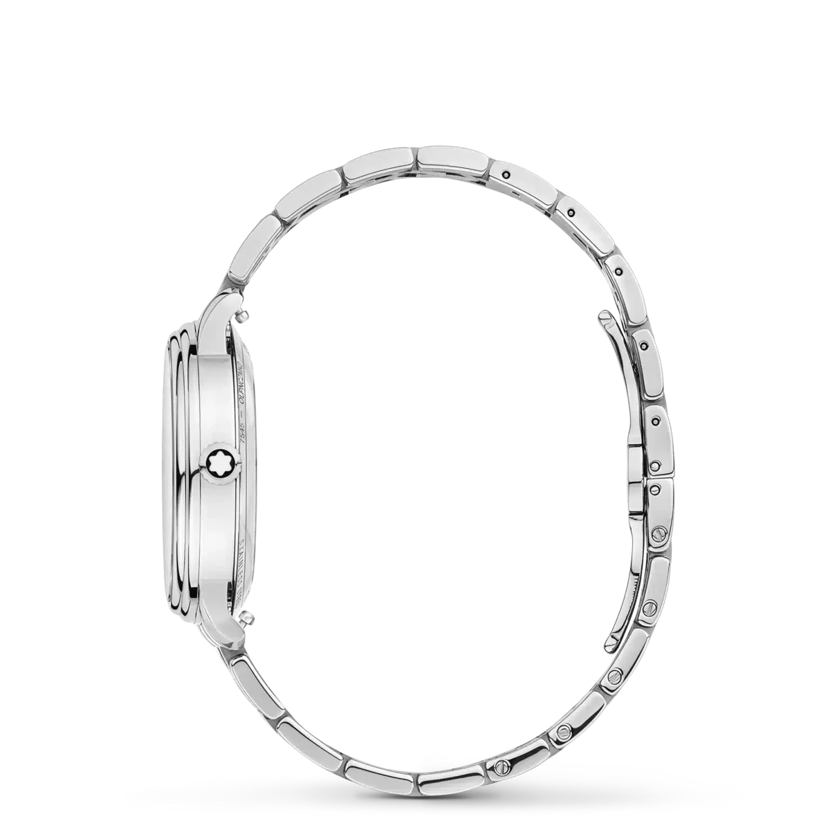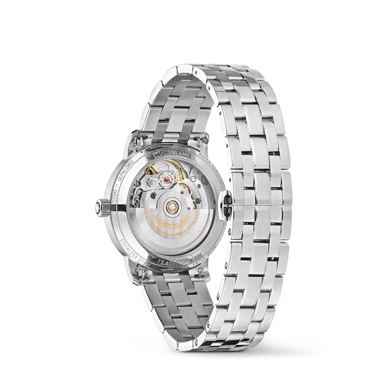 Die Montblanc Tradition Automatic Date verfügt über ein 32-mm-Edelstahlgehäuse mit geraden Bandanstößen und einer doppelt geformten Lünette. Der Zeitmesser verfügt über ein graues Zifferblatt, das die Topografie des Mont Blanc mit roségoldfarbenen römischen Ziffern und einer markanten römischen „XII” darstellt. Die schwertförmigen Stunden- und Minutenzeiger, der Sekundenzeiger und die Krone mit Montblanc Emblem sowie das austauschbare Edelstahlarmband runden das zeitgemäße, elegante Erscheinungsbild ab.