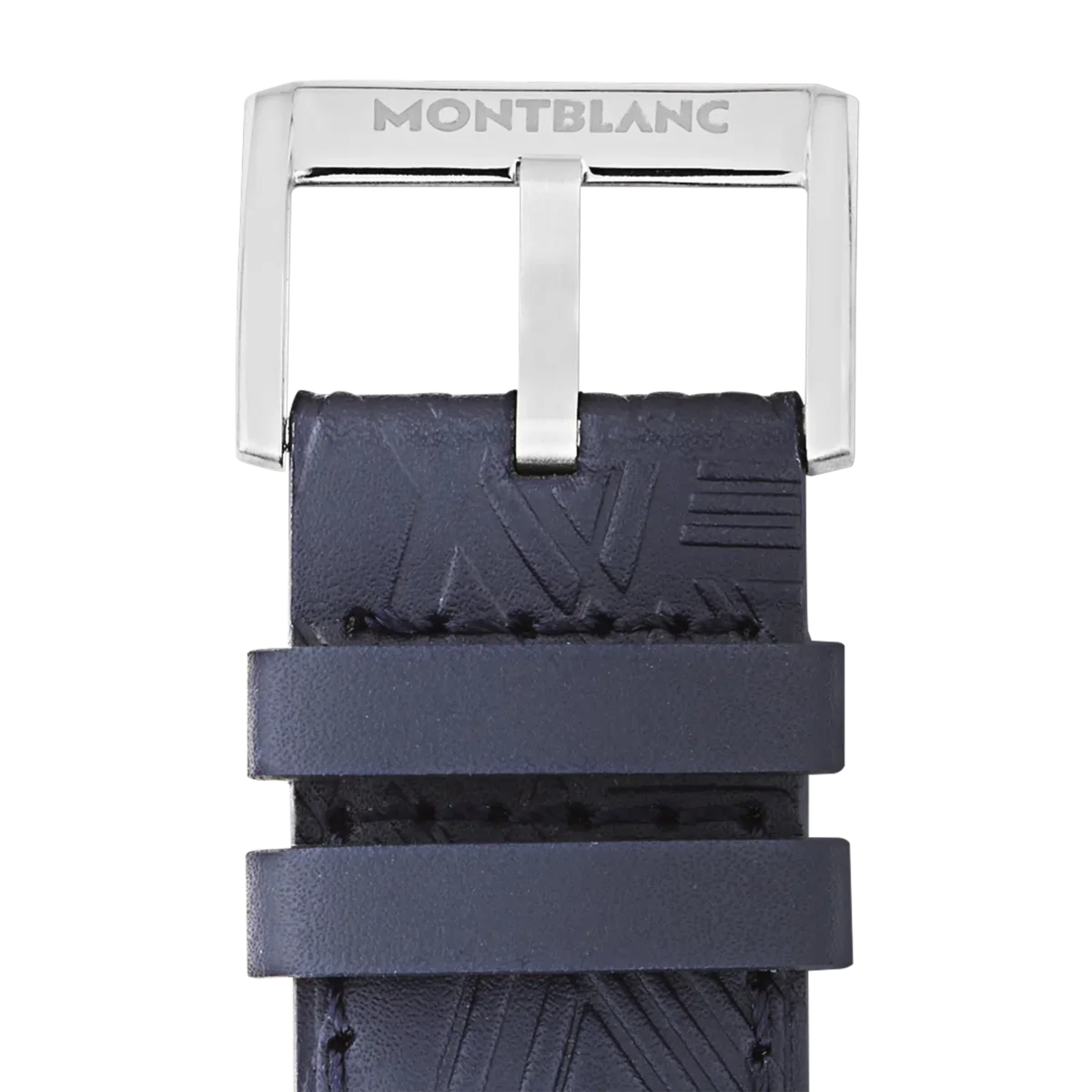 22 mm Kalbslederarmband mit Prägung im Widmanstätten-Muster, das auch in der Montblanc Starwalker Space Blue Schreibgerätekollektion zu finden ist. Verstellbare Dornschließe aus Edelstahl. Kompatibel mit allen Montblanc Summit Smartwatches.