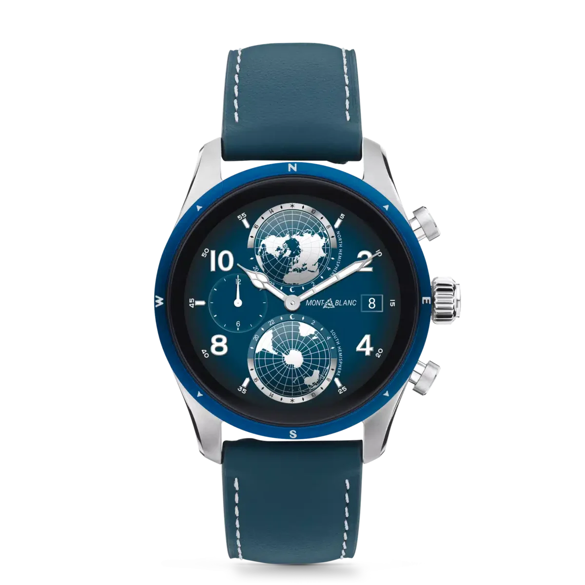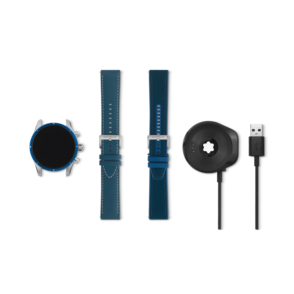 Begleit-App für Smartphones: Montblanc Summit. Erhältlich im App Store und Play Store. In der Verpackung In der Verpackung Summit 3 mit Sportarmband aus Kautschuk, zusätzlichem Kalbslederarmband, Ladestation, USB-Kabel, Sicherheitshandbuch und Schnellstartanleitung.
